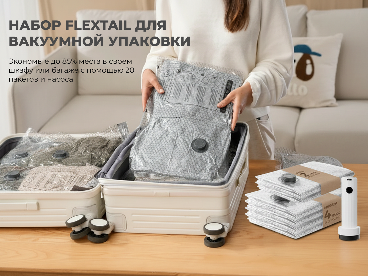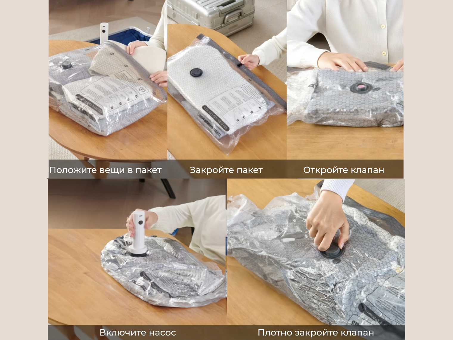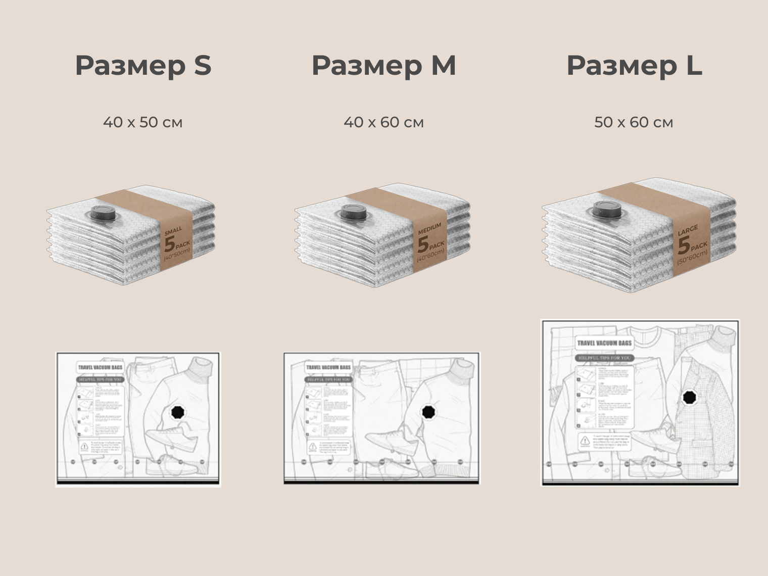 Система подходит для любого текстиля: от футболок и белья до тяжелых зимних пуховиков. Использование набора исключает появление «бугров» в чемодане — вещи становятся плоскими и равномерно распределяются по всей площади сумки.