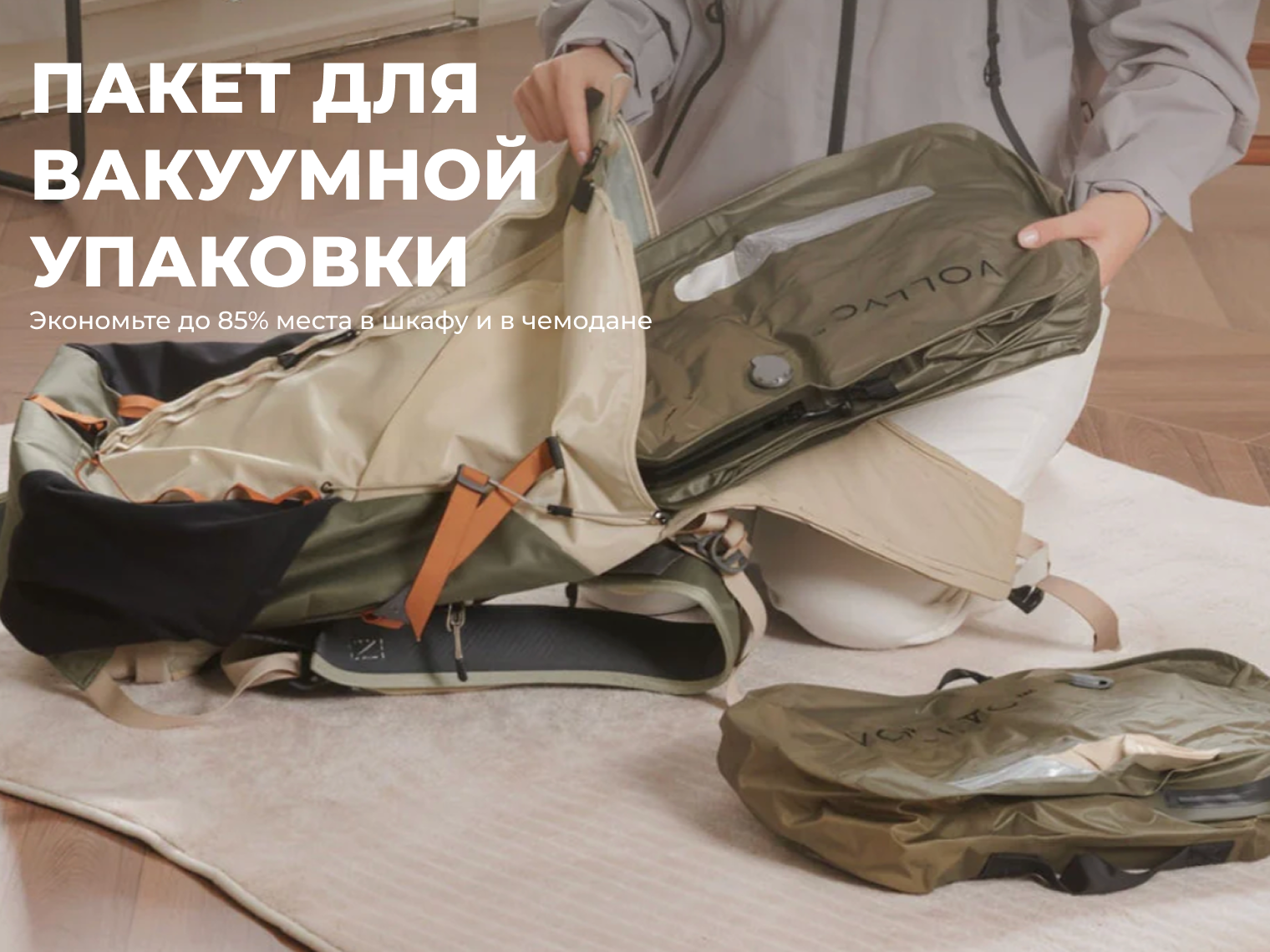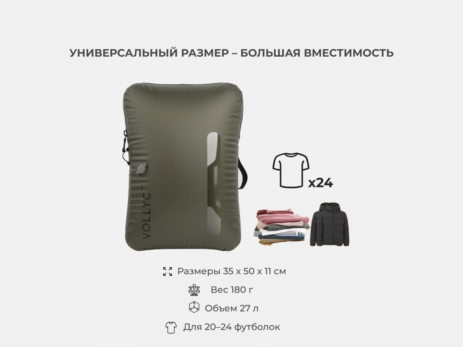 Vollyc EZY PACK — это многоразовая система для оптимизации места в багаже, которая освобождает до 85% пространства в чемодане или шкафу. В отличие от обычных пакетов, эта модель выполнена из прочного нейлона 70D, устойчивого к разрывам и истиранию.