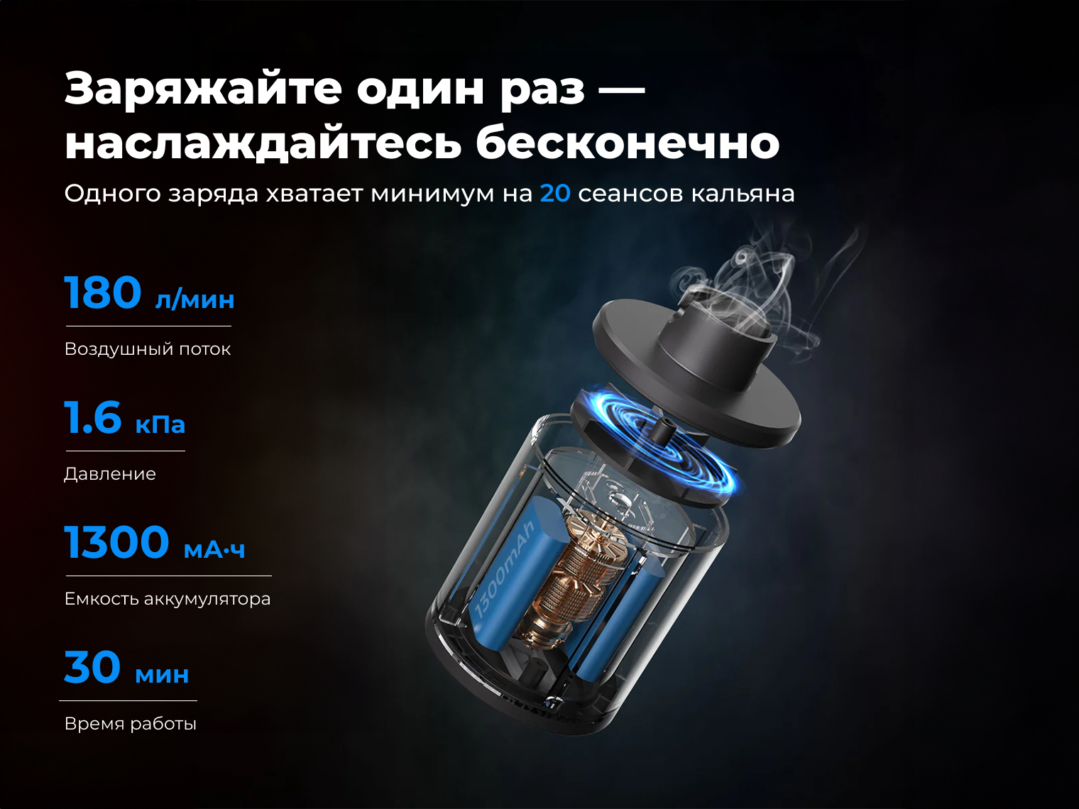 Насос имеет компактный цилиндрический дизайн и оснащен универсальным креплением, подходящим для большинства стандартных кальянных шлангов. Встроенный аккумулятор емкостью 1300 мА·ч гарантирует автономную подготовку 20+ сессий курения без подзарядки. Благодаря разъему USB Type-C и компактным габаритам, насос удобно заряжать от повербанка и использовать в полевых условиях, путешествиях или дома.
