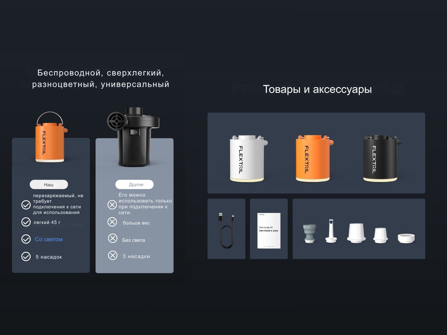 Комплектация | Насос, 2 пакета, 5 сменных насадок для разных клапанов, зарядный USB-C кабель и мешочек для хранения |