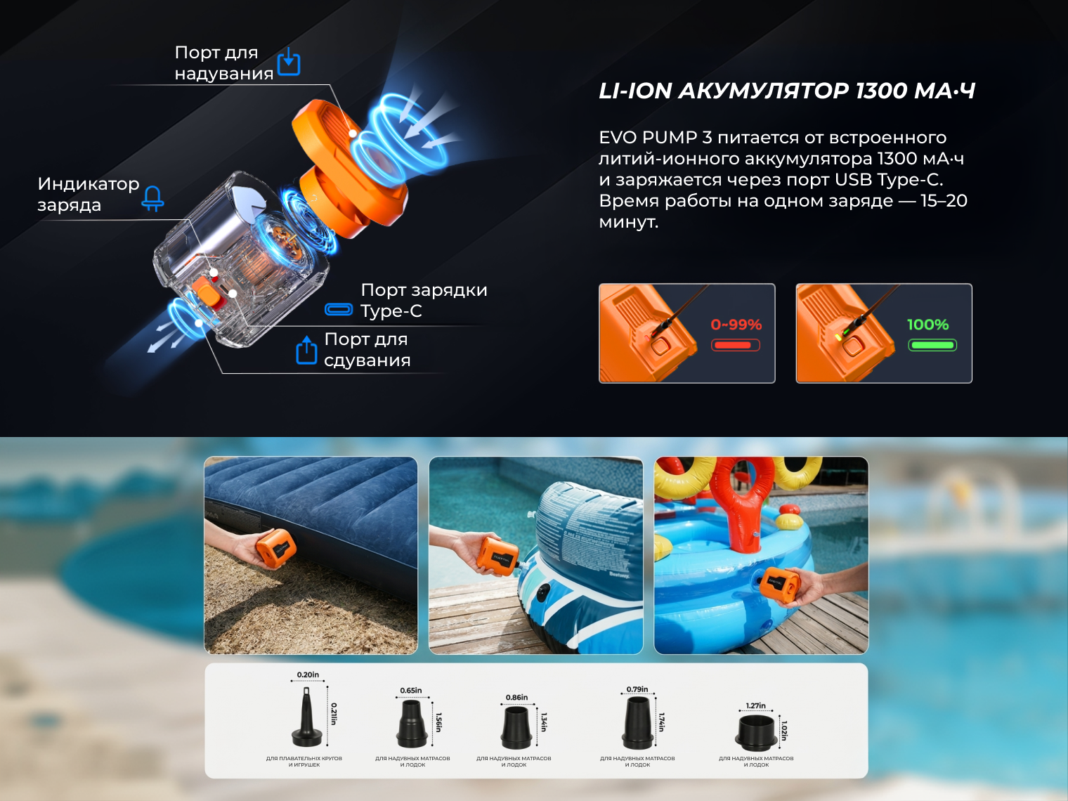 Flextail Evo Pump 3 с легкостью помещается в ладони и весит всего 350 г, что делает транспортировку предельно комфортной как в туристическом рюкзаке, так и в небольшой сумке. В комплекте идут 5 фирменных насадок с разным диаметром для эффективной накачки предметов различного типа.