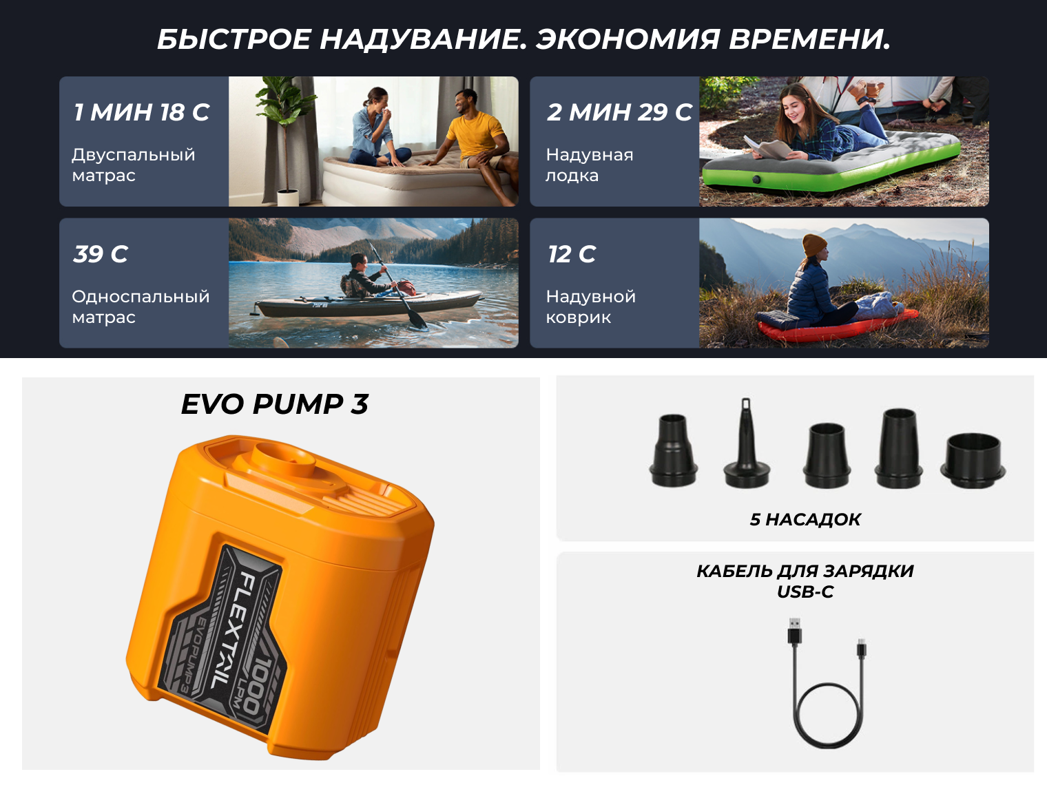 Воздушный насос Flextail Evo Pump 3, зарядный кабель USB Type-C, 5 насадок.