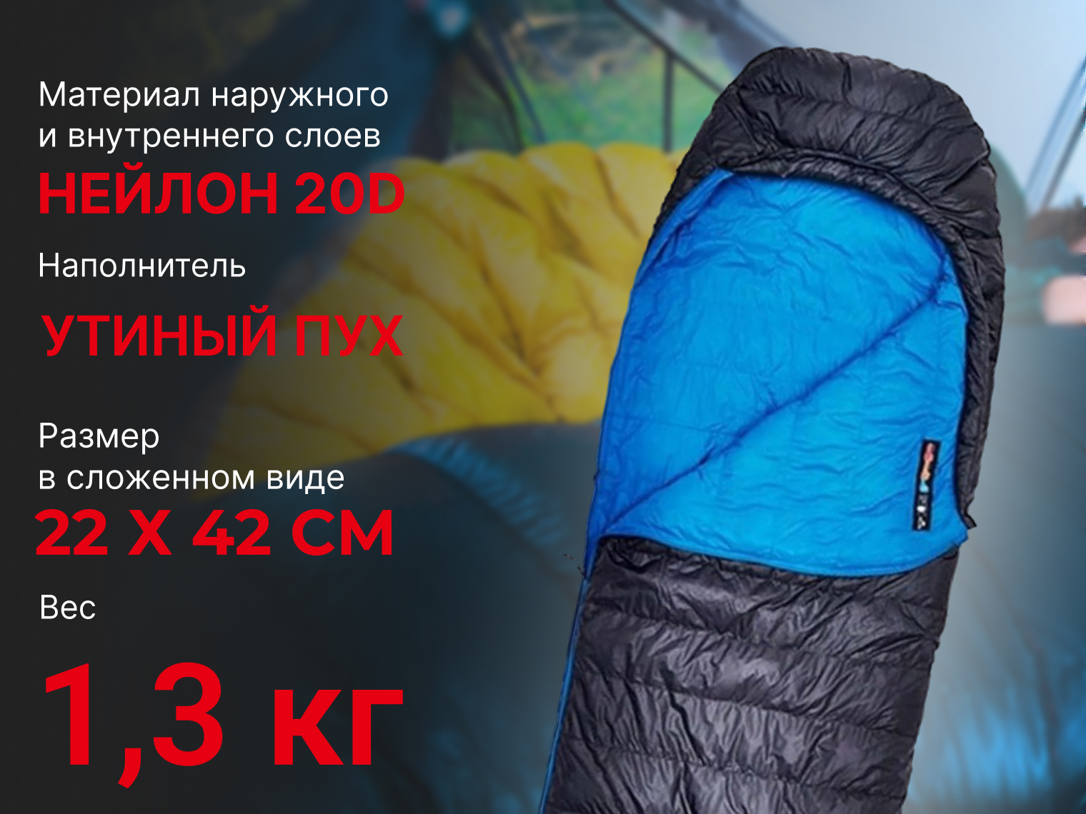 Спальник в размере М достигает размеров 210 х 75 см в разложенном виде. После складывания размеры уменьшаются до Ø20 х 42 см.