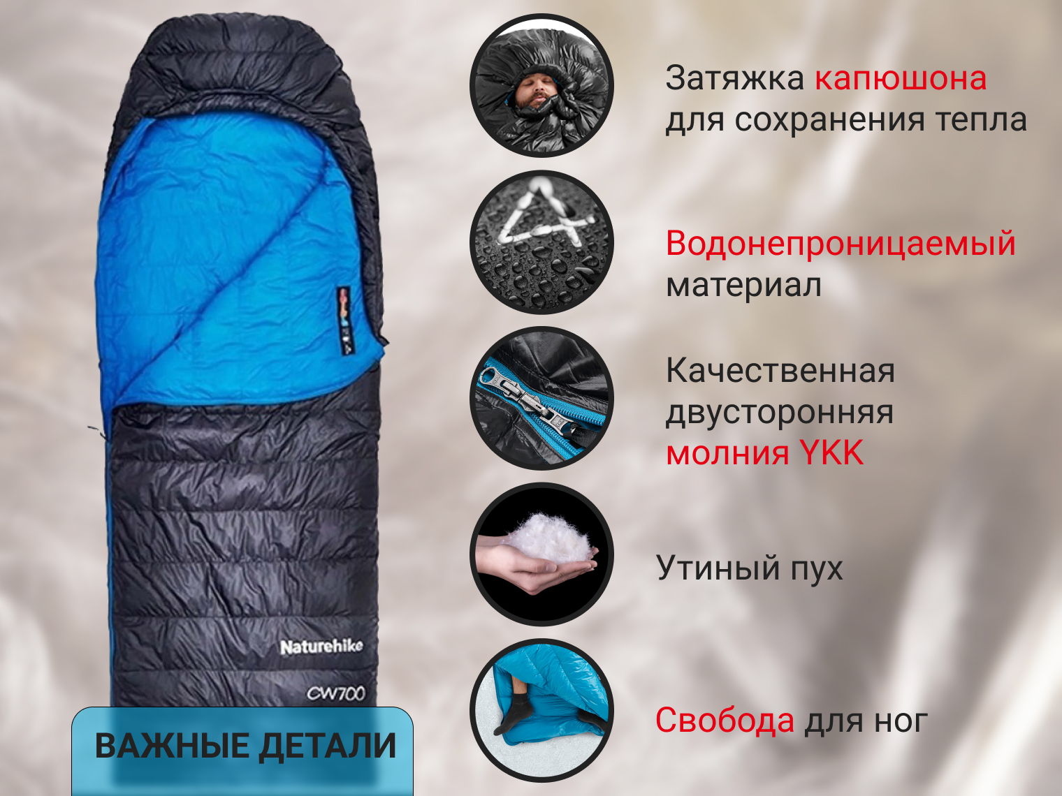 Спальник Naturehike CW700 гарантирует здоровый сон на природе зимой и в холодное межсезонье. Модель рассчитана на температуру от -1.7°C до -7.9°C, оберегая от переохлаждения, а водоотталкивающие материалы исключают намокание во влажную погоду или в случае выпадения конденсата в палатке.