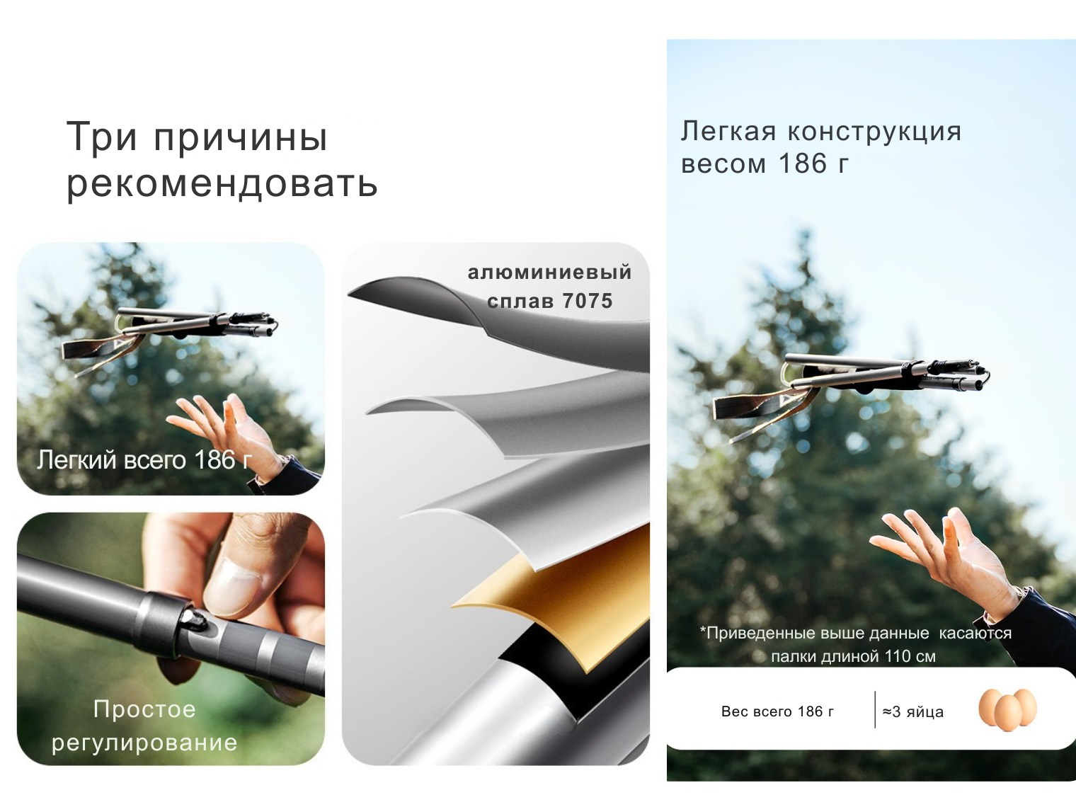 Конструкция складывается до 35 см в длину и весит всего 186 г, что упрощает транспортировку в сумке или на рюкзаке.
