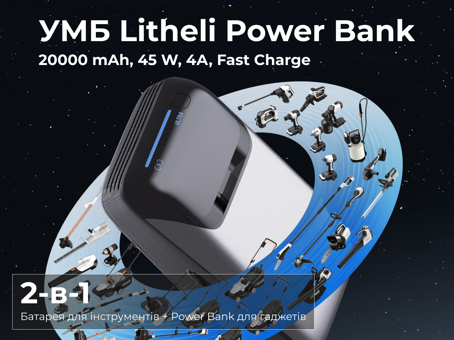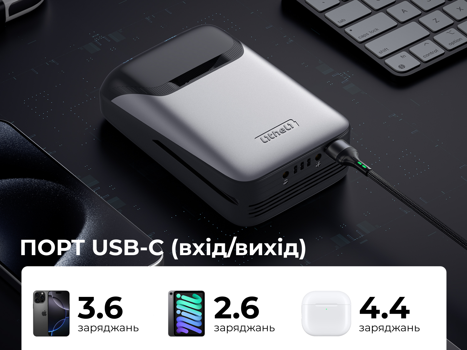 Цей павербанк створений як універсальне джерело енергії для поїздок, роботи чи використання вдома. Завдяки потужності 45 Вт він швидко заряджає не лише телефони, а й ноутбуки через порт USB-C. Крім зарядки гаджетів, пристрій можна використовувати для живлення техніки Litheli серії U20.