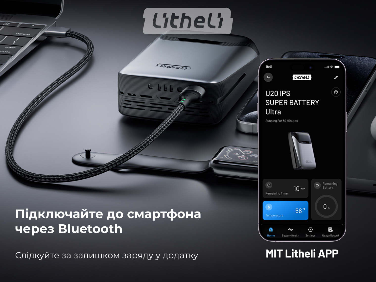 У моделі Litheli U20 Ultra 4.0 Ah легко стежити за залишком енергії. На корпусі є цифровий дисплей та світлова панель, що показують стан роботи. Також пристрій підключається до смартфона через Bluetooth. У додатку Litheli APP можна в реальному часі бачити точний відсоток заряду, температуру осередків та загальний стан павербанка.