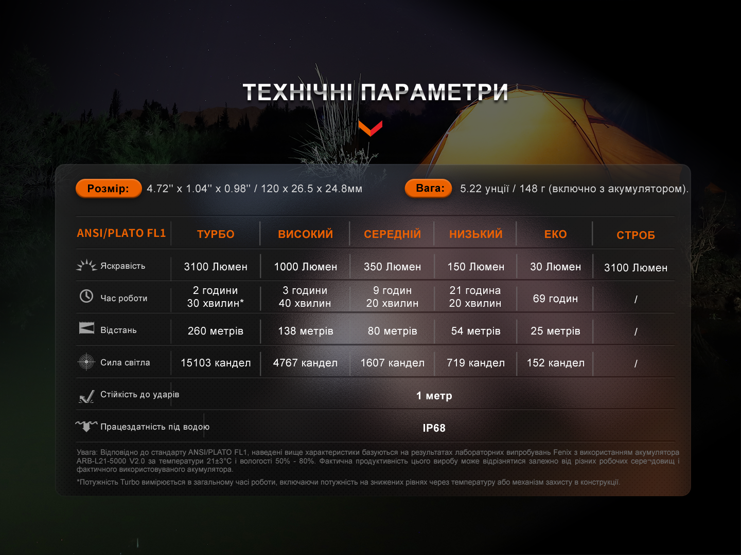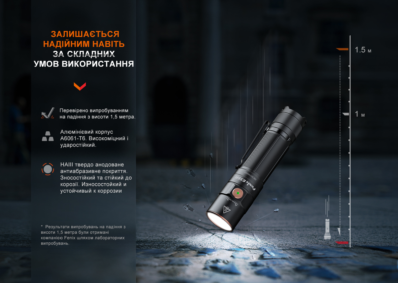 Комплектація | Fenix E35R со съемной клипсой, аккумулятор Fenix 5000 мА·ч, темляк на руку, кабель USB-C для зарядки, гарантийный талон, руководство по эксплуатации |
