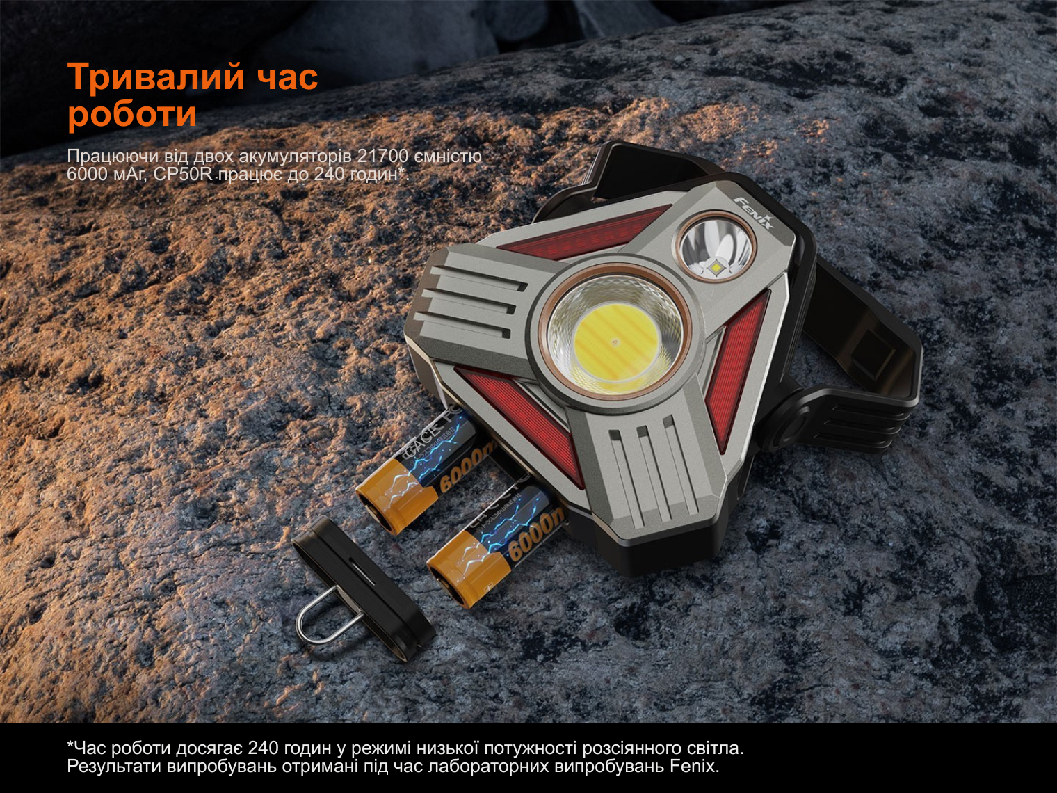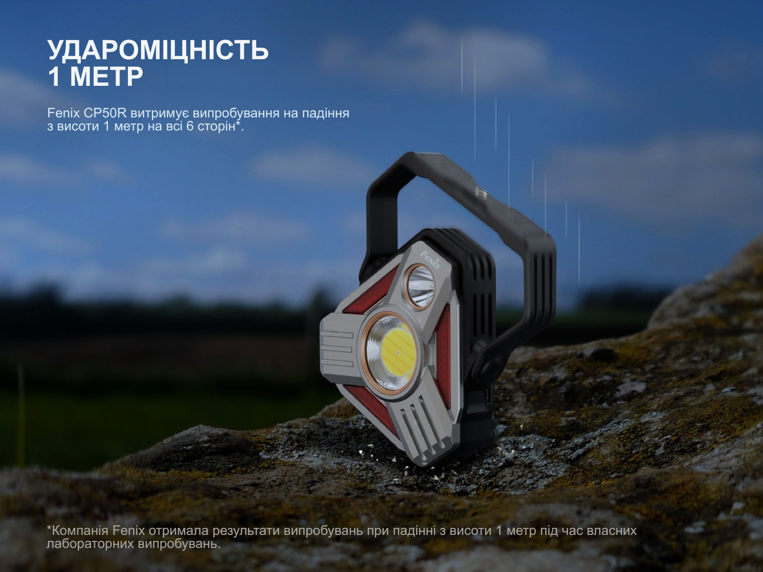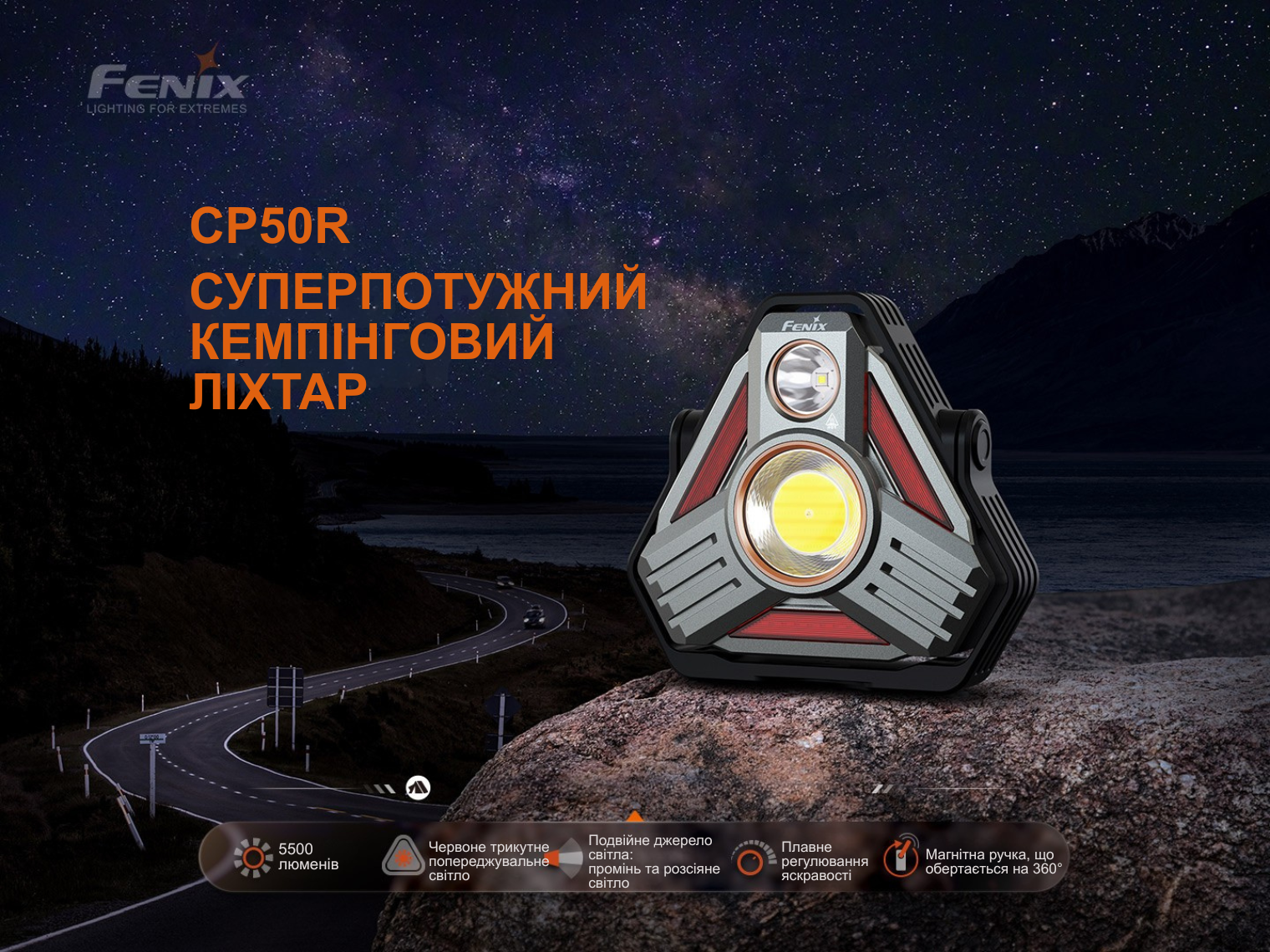 Fenix CP50R — це професійний ліхтар для кемпінгу, сервісних робіт та дорожніх служб, який пропонує розширений функціонал для професійних та повсякденних завдань. Унікальна трикутна форма корпусу нагадує попереджувальний знак, що робить модель незамінним помічником на небезпечних робочих майданчиках та на дорозі.