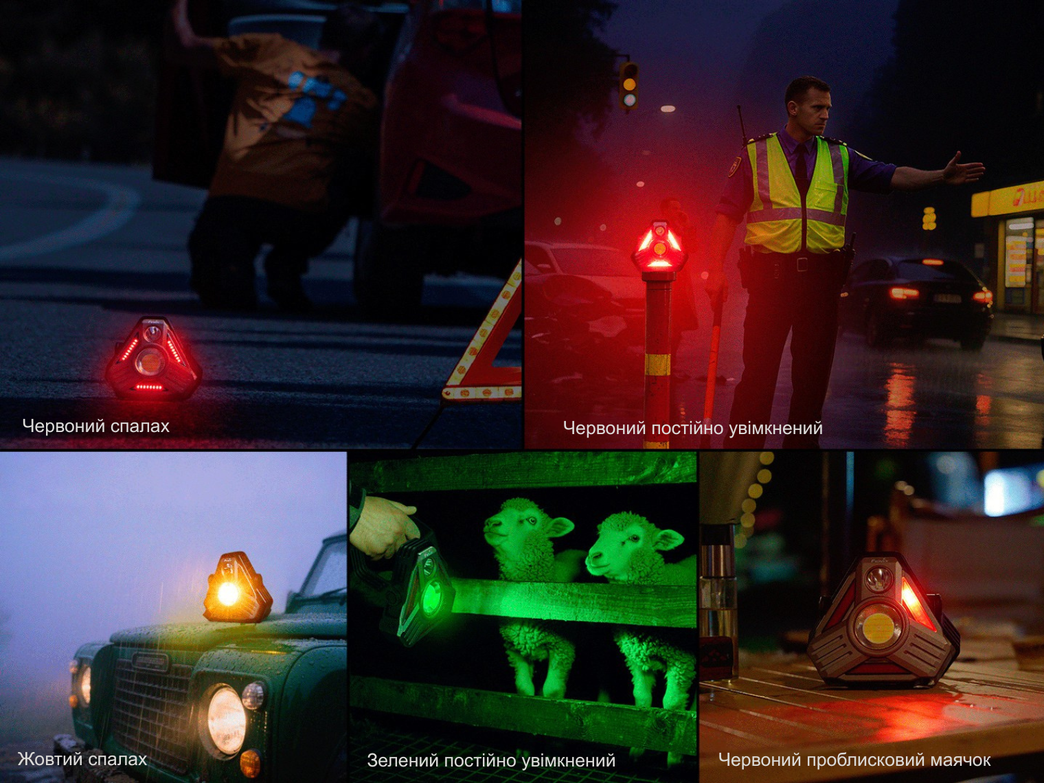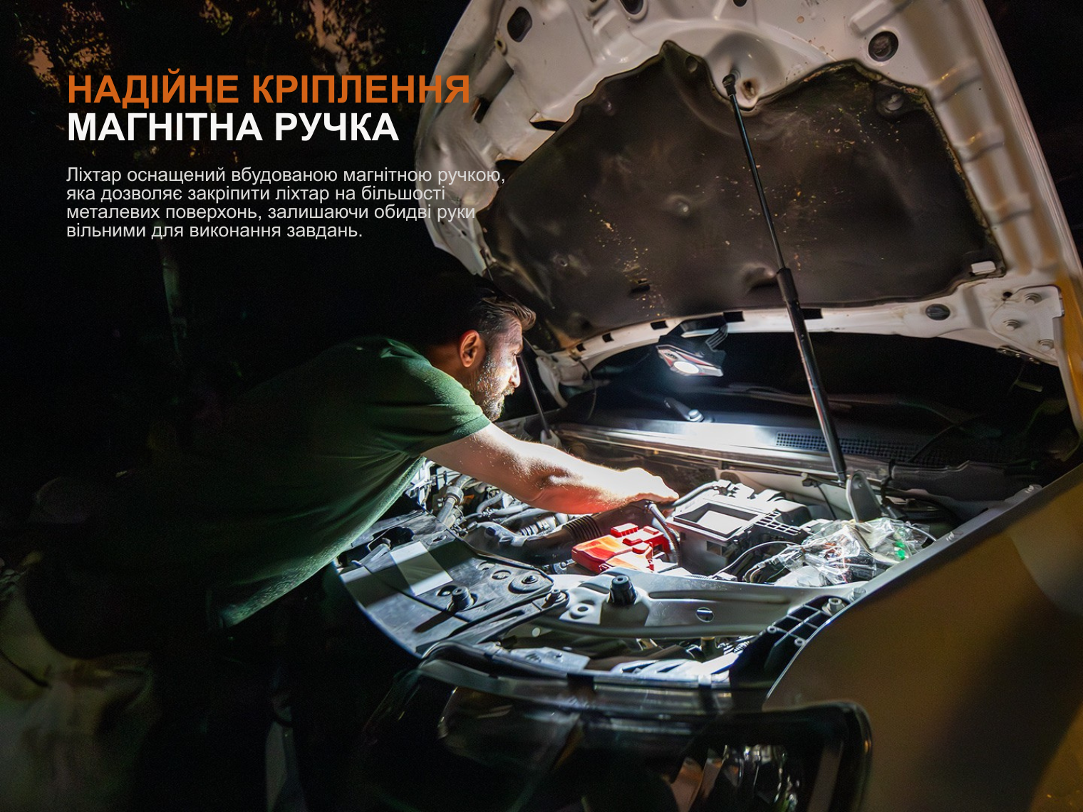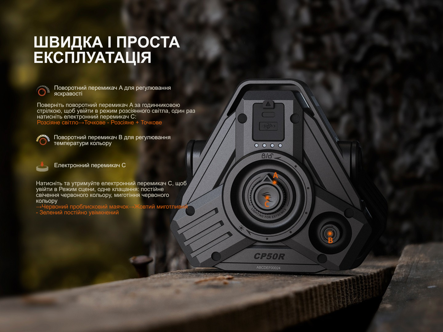 Fenix CP50R — це професійний ліхтар для кемпінгу, сервісних робіт та дорожніх служб, який пропонує розширений функціонал для професійних та повсякденних завдань. Унікальна трикутна форма корпусу нагадує попереджувальний знак, що робить модель незамінним помічником на небезпечних робочих майданчиках та на дорозі.