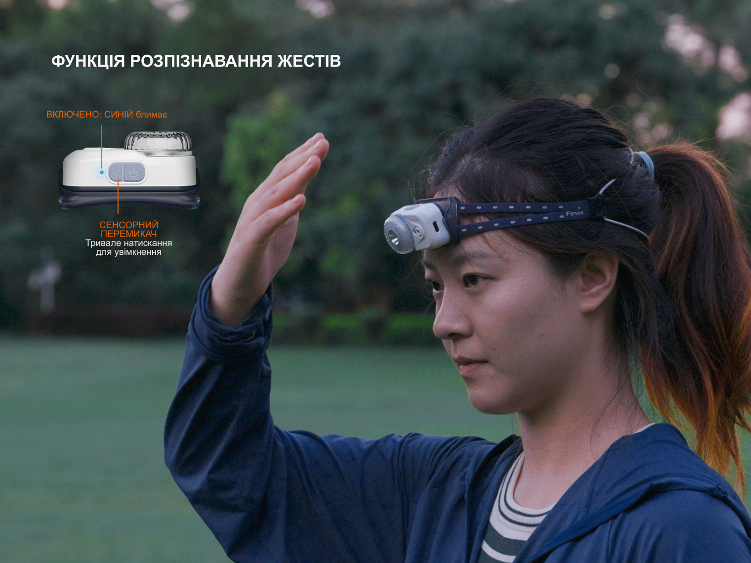 Система керування Fenix HL17R складається з електронної кнопки у верхній частині корпусу та переднього обертового перемикача.