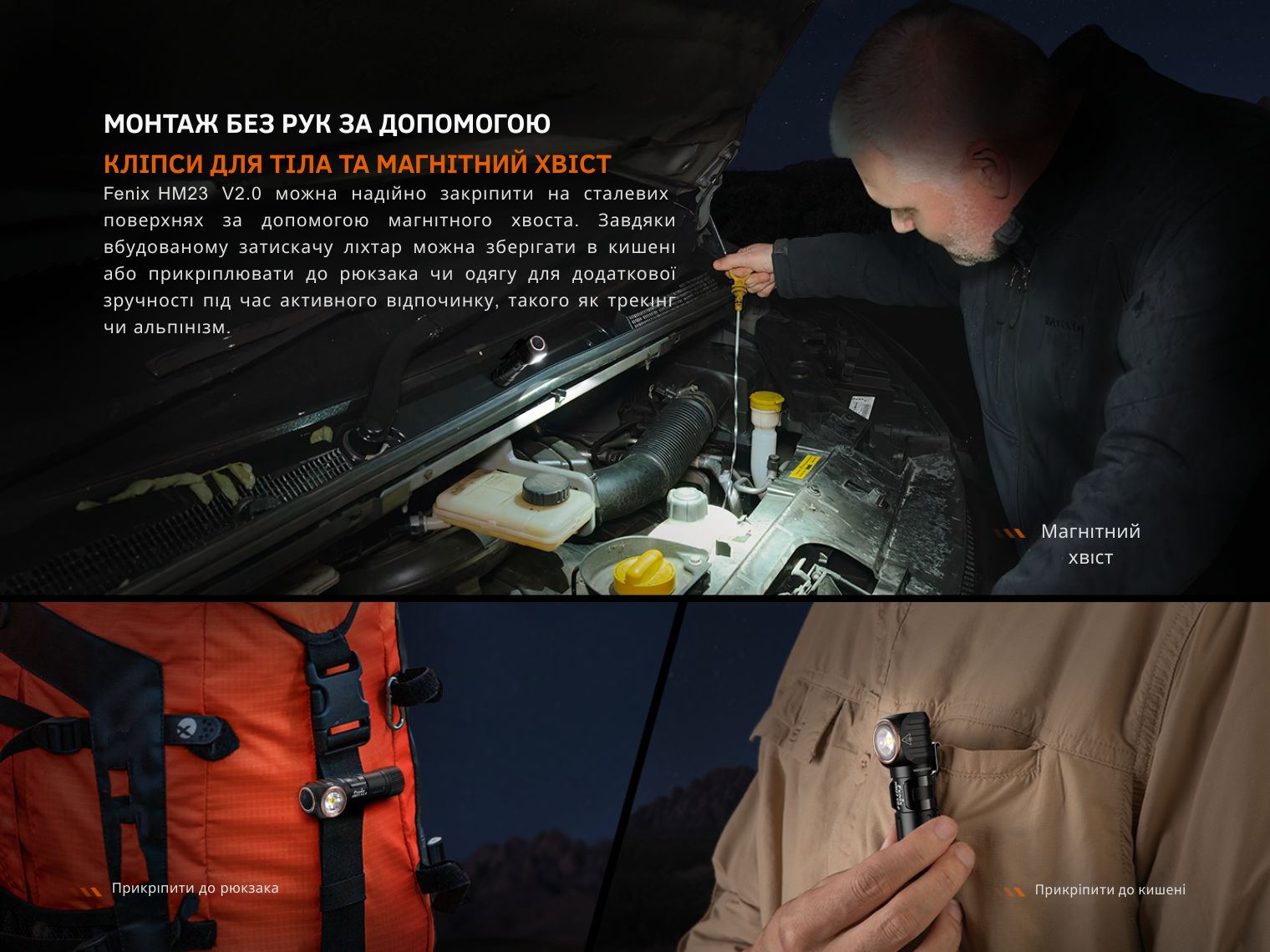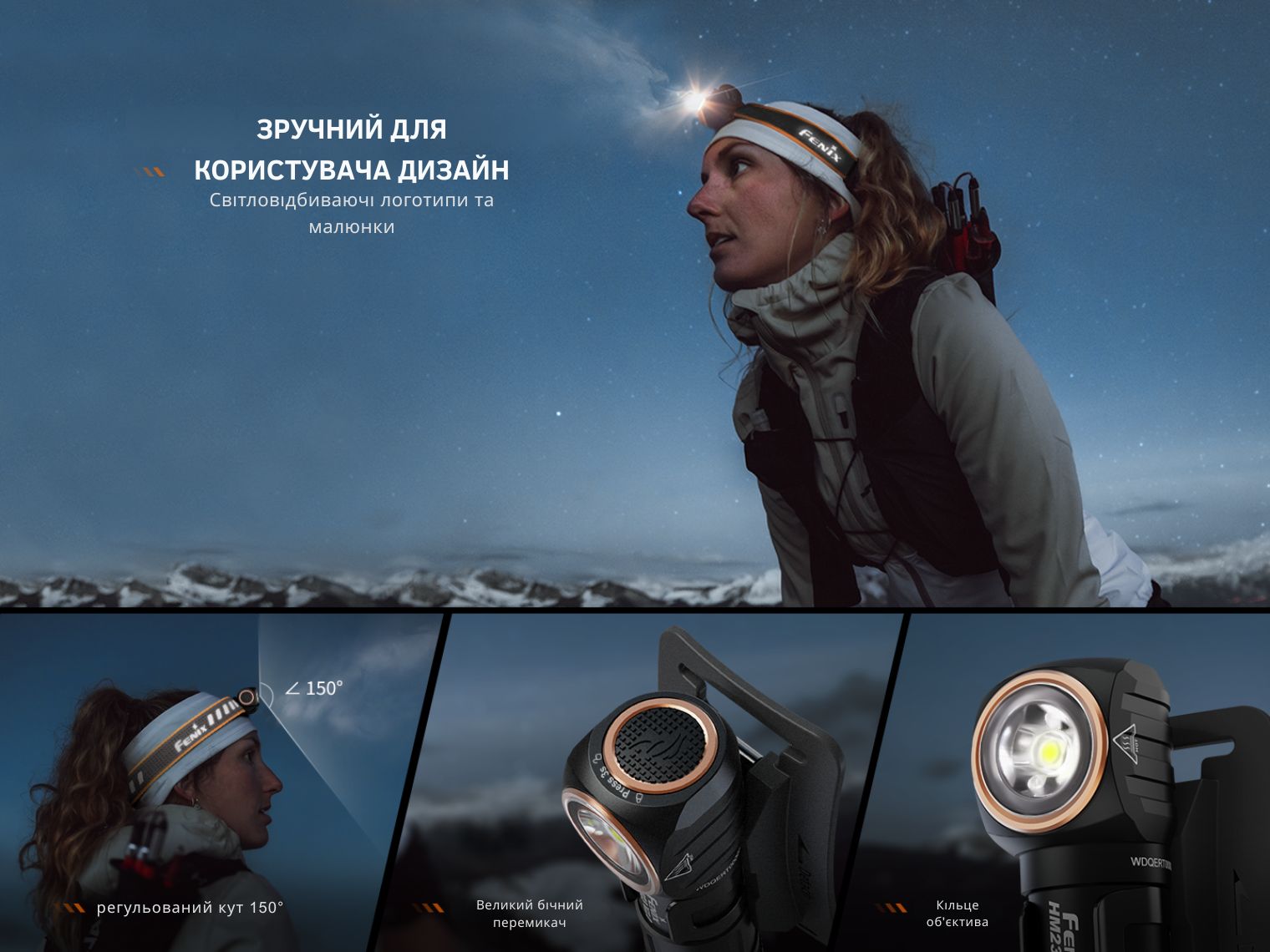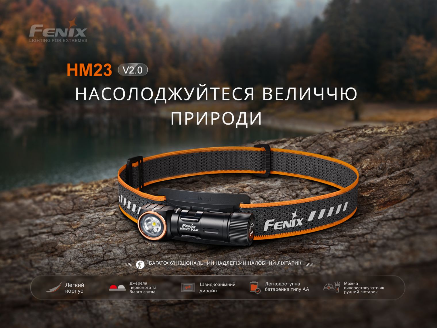 Fenix HM23 V2.0 — мультиформатний ліхтар з налобною перфорованою резинкою, доповненою світловідбивними елементами.