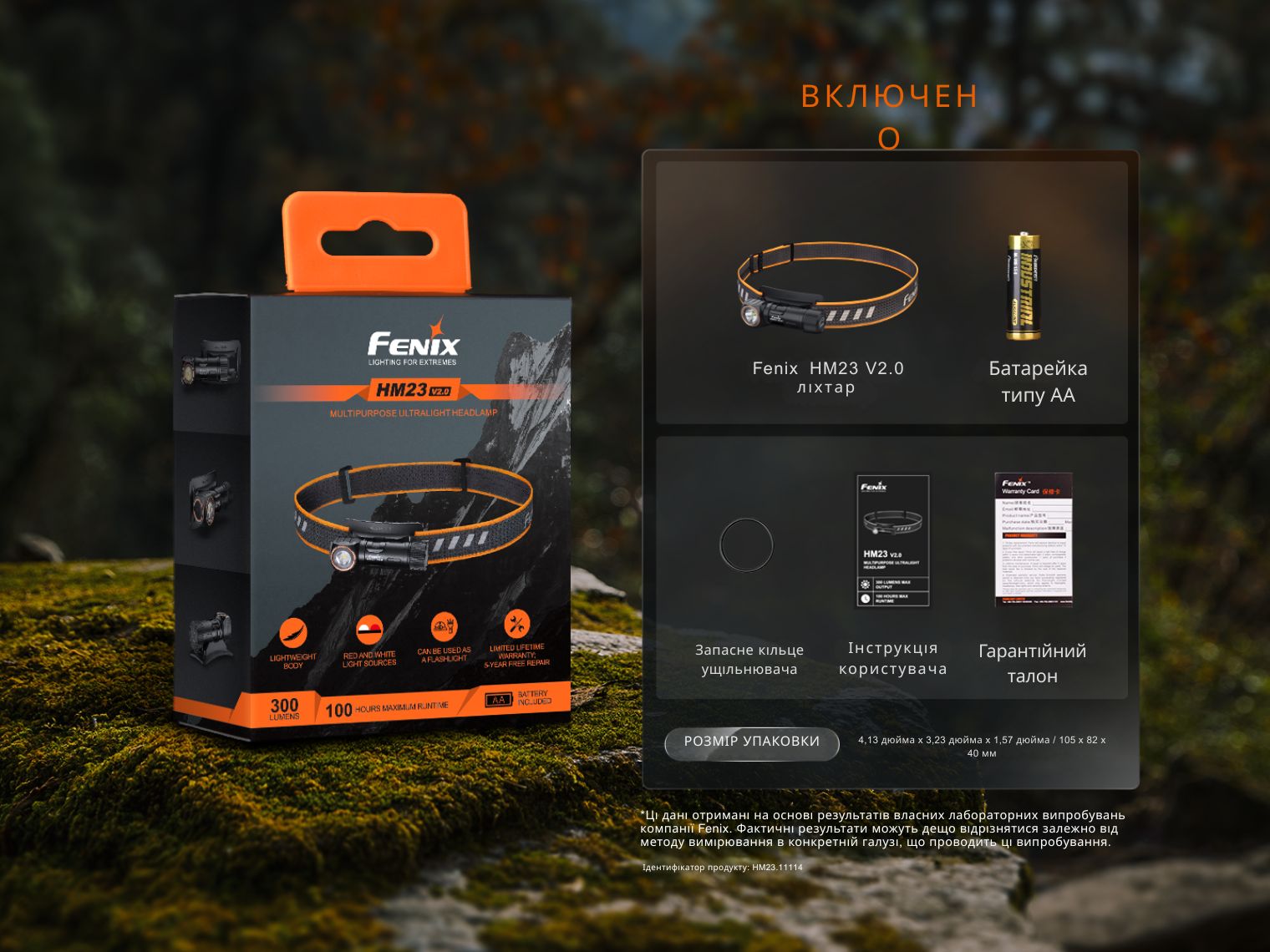 Комплектація  | Fenix HM23 V2.0 с налобной резинкой, батарея AA, запасное уплотнительное кольцо, инструкция |