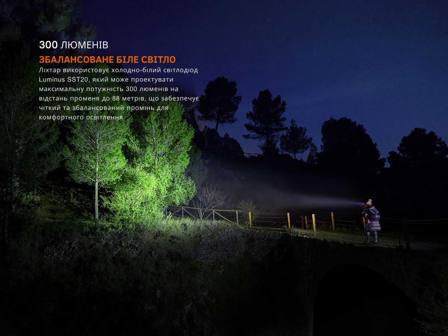 Поєднання одного білого світлодіода Luminus SST20 та двох червоних 2835 робить ліхтар актуальним не тільки для повсякденної експлуатації, а й для професійних тактичних цілей. Біле світло яскравістю до 300 лм (колірна температура 5900–6500К) дає детальне освітлення на дистанції 88 м, а кольоровий червоний промінь забезпечує м'яке підсвічування зі збереженням нічного зору.