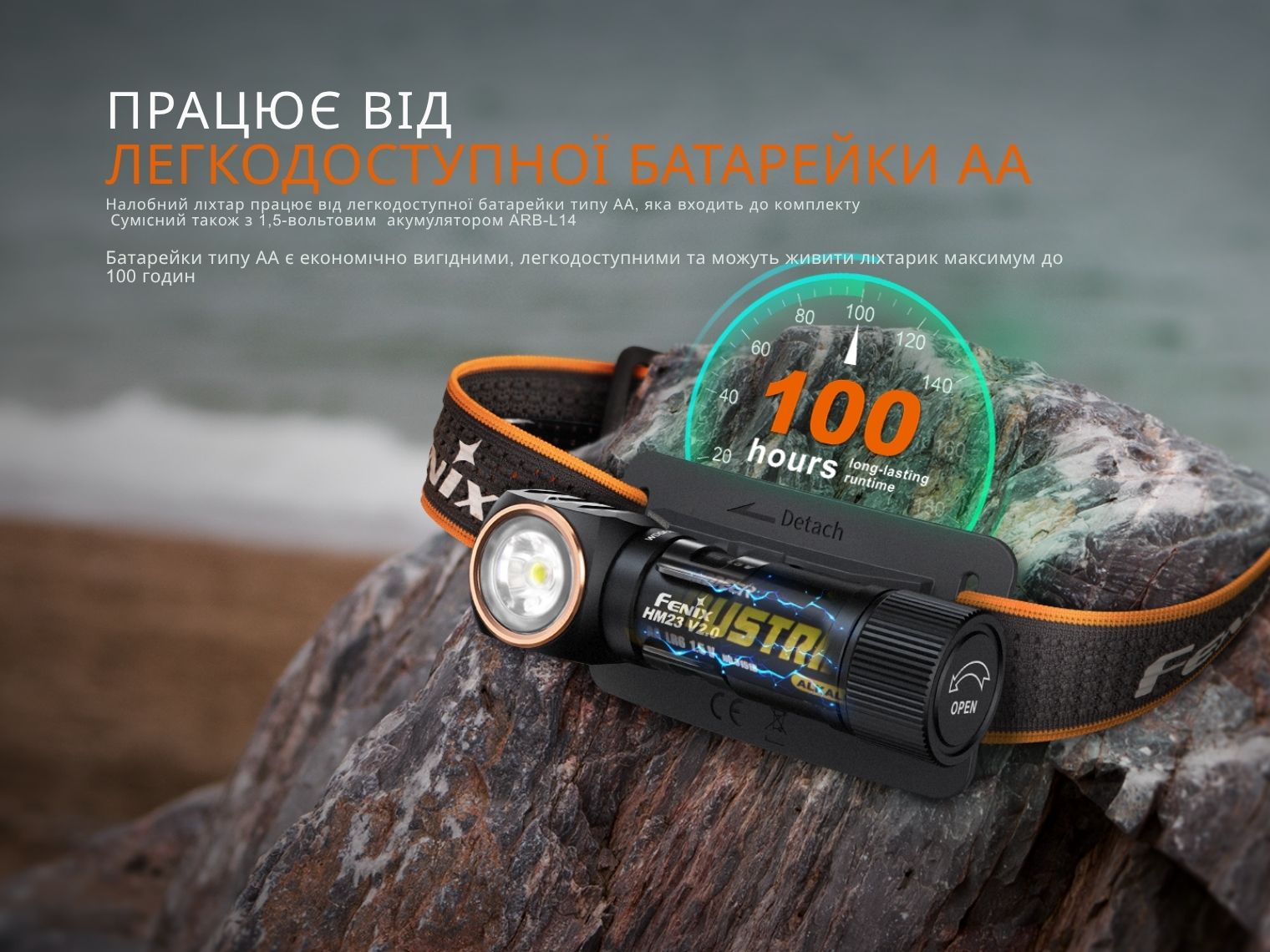HM23 V2.0 живиться від однієї батареї AA, яка йде у комплекті. Ліхтар також сумісний з перезаряджуваним акумулятором Fenix ARB-L14-U типорозміру 14500 (1.5 В).
