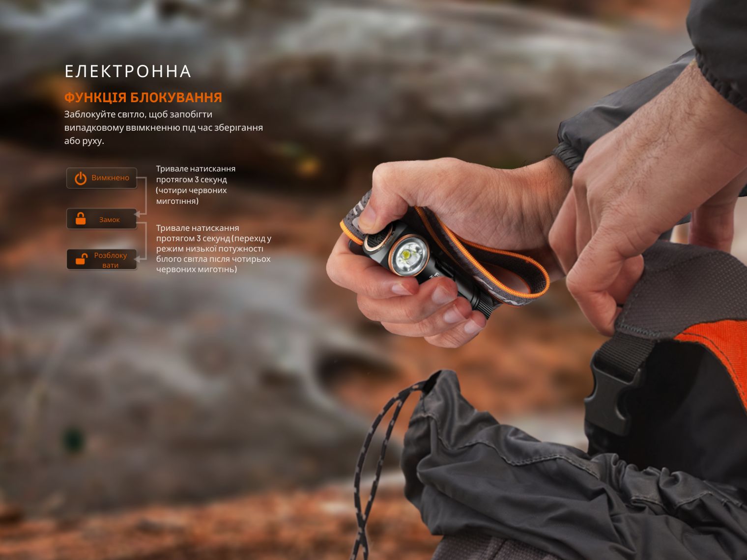 Для безпечного транспортування передбачено функцію електронного блокування, що унеможливлює випадкове ввімкнення ліхтаря.