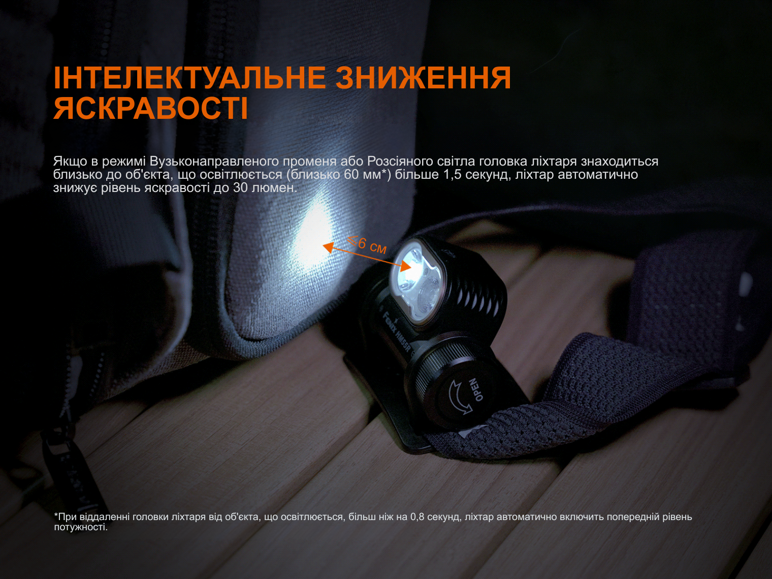 Функціонал ліхтаря доповнює інтелектуальний датчик наближення. Він спрацьовує у випадку, якщо відстань між головою моделі та освітлюваним об'єктом становить ≤60 мм протягом 1.5 секунди. У такому випадку яскравість світла автоматично знижується до 30 люменів, щоб уникнути загоряння предмета від нагрівання під впливом надпотужного променя.