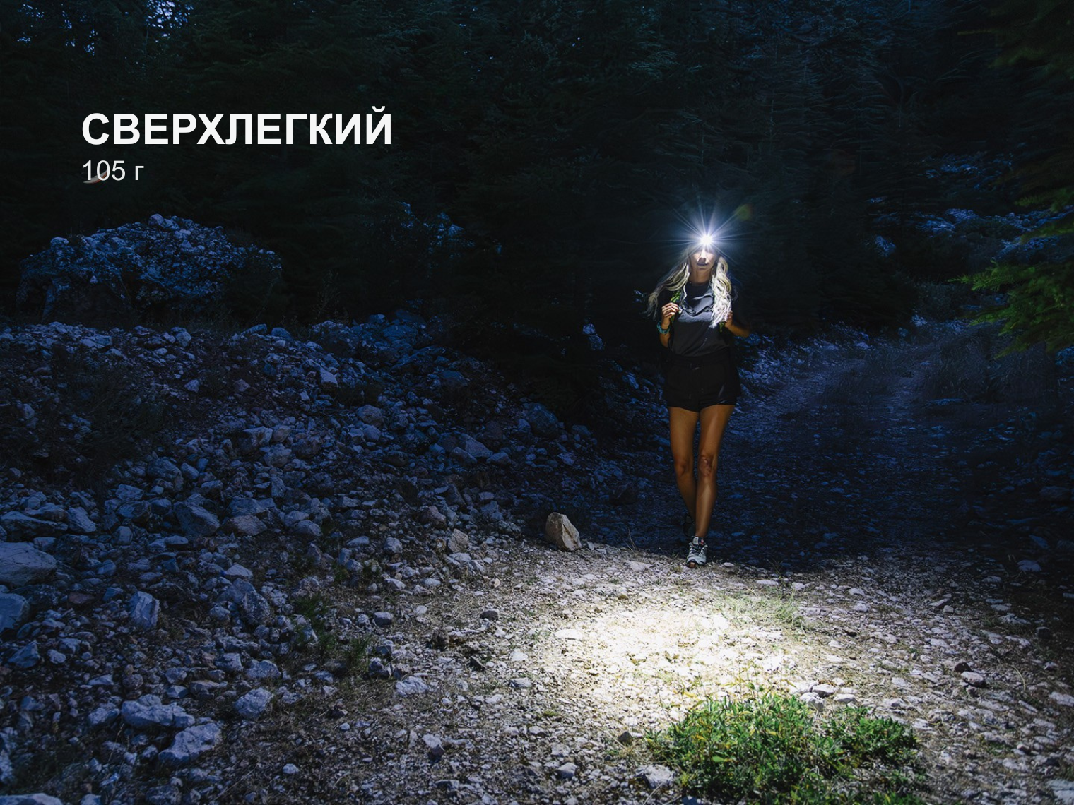 Ліхтар важить 105 г разом з акумулятором та оголов'ям. Налобна резинка має перфорований дизайн для повітропроникності та комфортної посадки на голові без стискання. Ви можете регулювати напрямок променя шляхом нахилу пристрою у кріпленні.