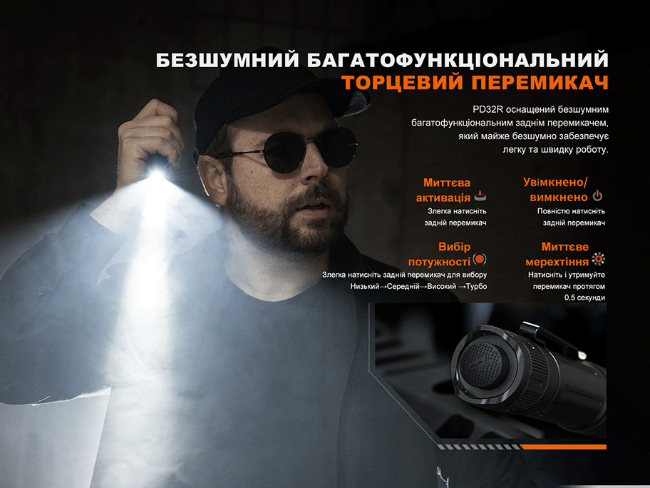 Ліхтар Fenix PD32R управляється хвостовим (тактичним) перемикачем. Його абсолютно безшумна робота є головною перевагою цієї моделі та дозволяє беззвучно вмикати та вимикати пристрій, а також задавати потрібну яскравість.
