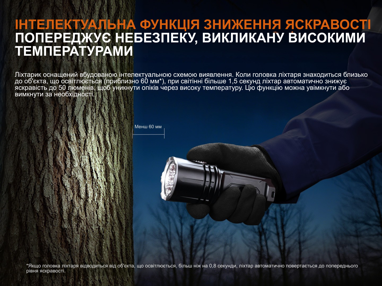 Ліхтар доповнений інтелектуальним датчиком наближення. Він відповідає за автоматичне зниження яскравості до 50 люмен, якщо голова працюючого пристрою наближається до освітлюваної поверхні ближче ніж на 60 мм. Ця функція запобігає випадковому займанню предметів, на які впливає надпотужний промінь.