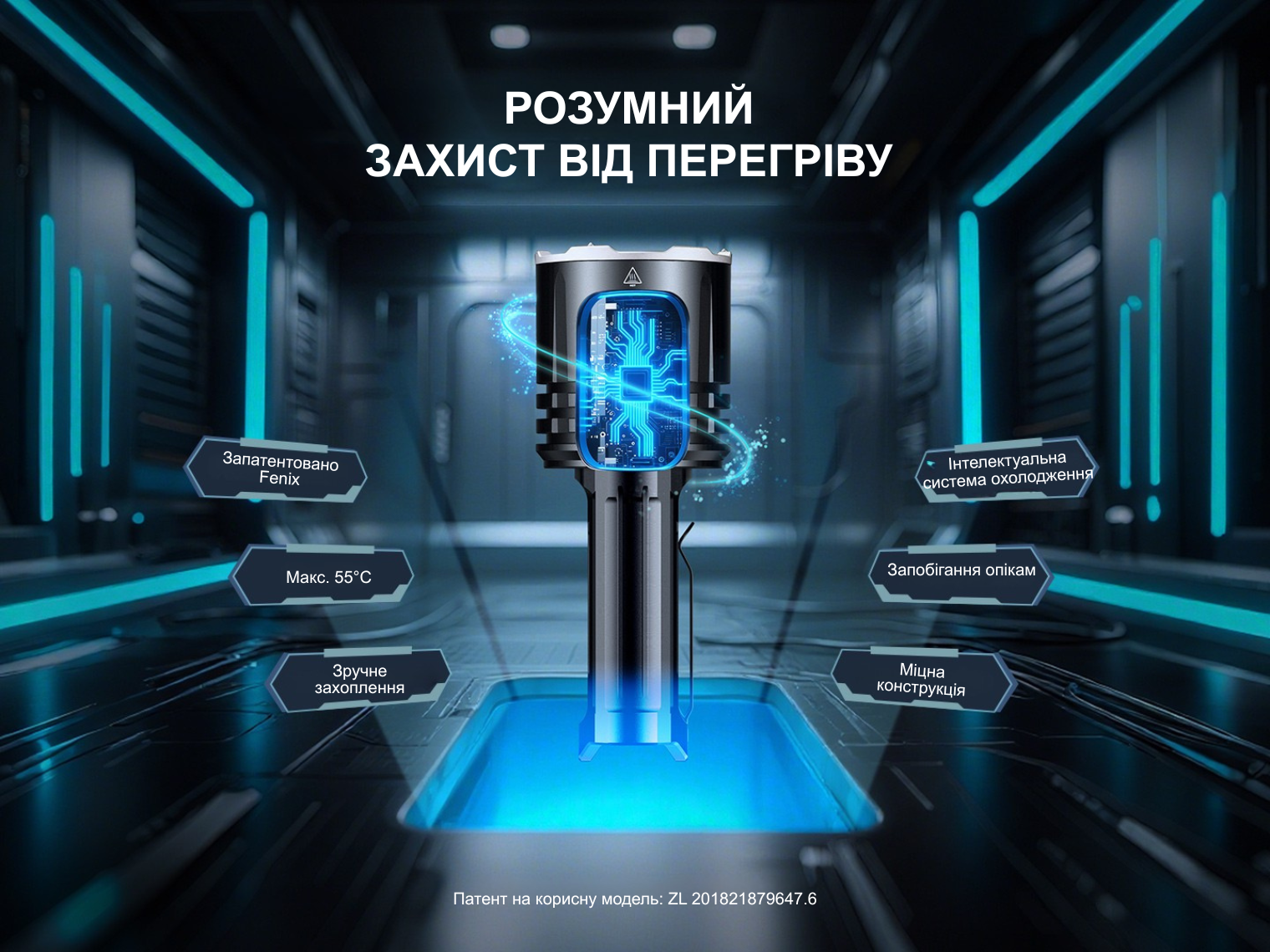 Корпус з авіаційного алюмінію з анодованою поверхнею стійкий до подряпин, механічних пошкоджень, окислення. Плоска хвостова частина адаптована під комфортне захоплення без ковзання у долоні, а глибокі ребра в голові відводять тепло, накопичене під час тривалої роботи електроніки на високій потужності.