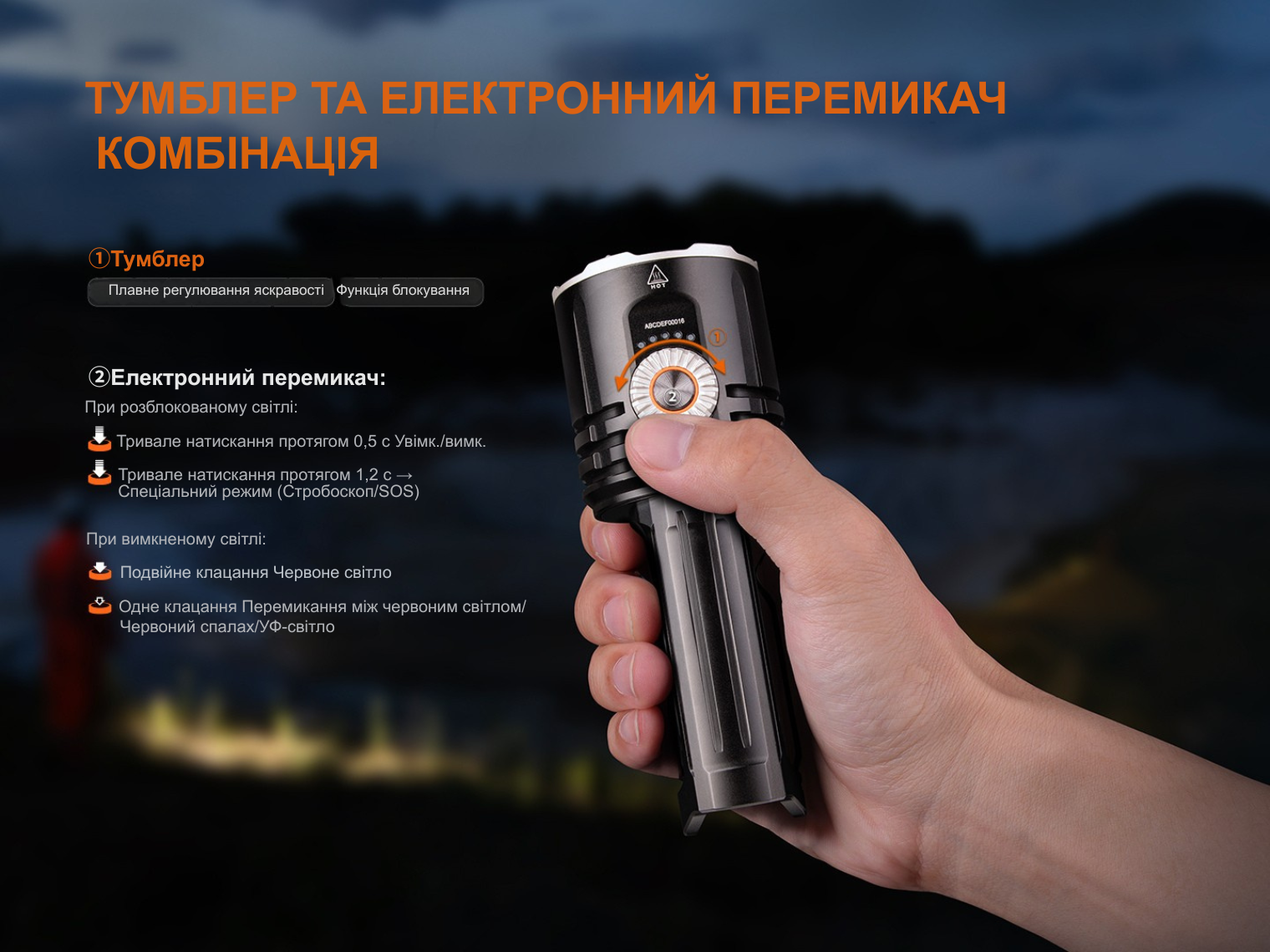 Керування за допомогою електронної кнопки та обертового перемикача FlexiSensa дозволяє швидко змінювати налаштування однією рукою. Ви також можете блокувати ліхтар, щоб уникнути випадкової активації та витрати заряду під час транспортування.
