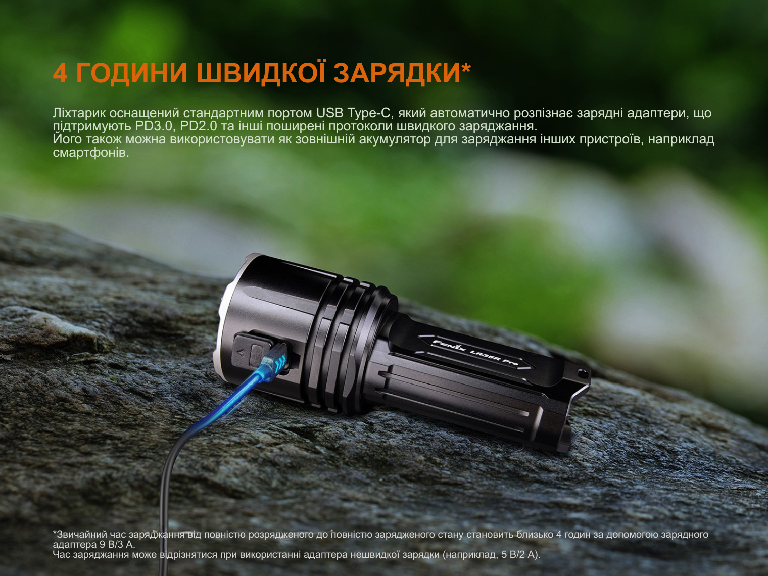 Зарядний порт USB-C підтримує протоколи швидкого заряджання PD2.0, PD3.0 тощо. Середній час заряджання — 4 год. Порт є двонапрямним і підходить для заряджання сторонньої техніки, дозволяючи використовувати ліхтар як переносний Power Bank.