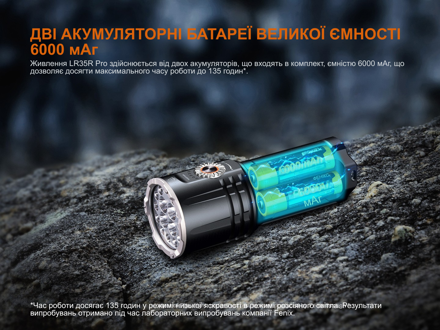 Fenix LR35R PRO живиться від блоку з 2 акумуляторів по 6000 мАгод з комплекту. Це Li-ion батареї, які несприйнятливі до «ефекту пам'яті» та витримують понад 500 циклів заряджання/розряджання зі збереженням 75% від початкової ємності.