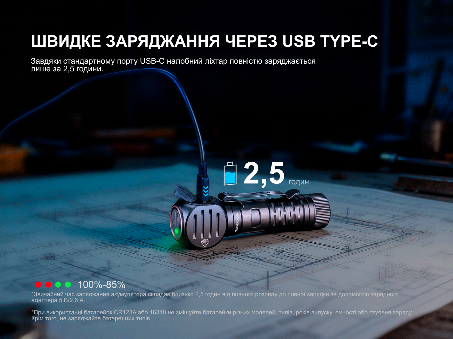 Живлення забезпечує один акумулятор 18650, а фірмова батарея Fenix ARB-L18-4000 ємністю 4000 mAh уже йде в комплекті.Заряджається ліхтар через вбудований порт USB Type-C — це зручно, бо підійде звичайний кабель, і ніякі сторонні пристрої не потрібні.