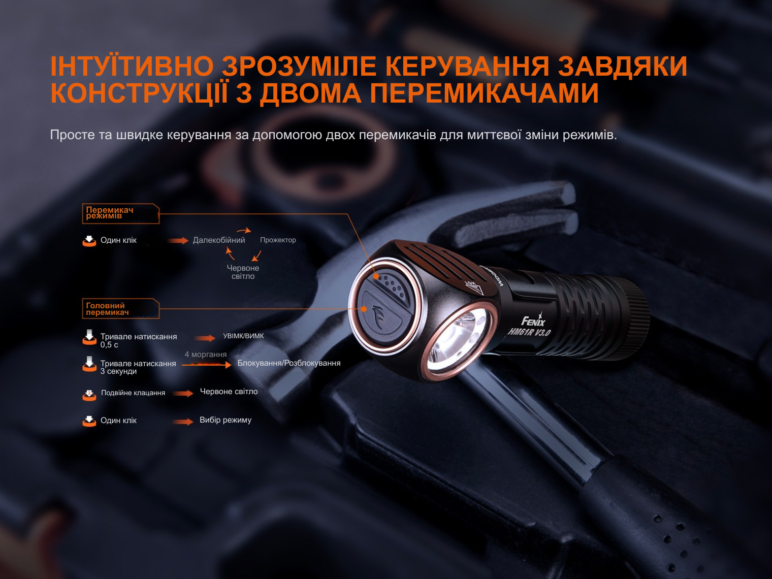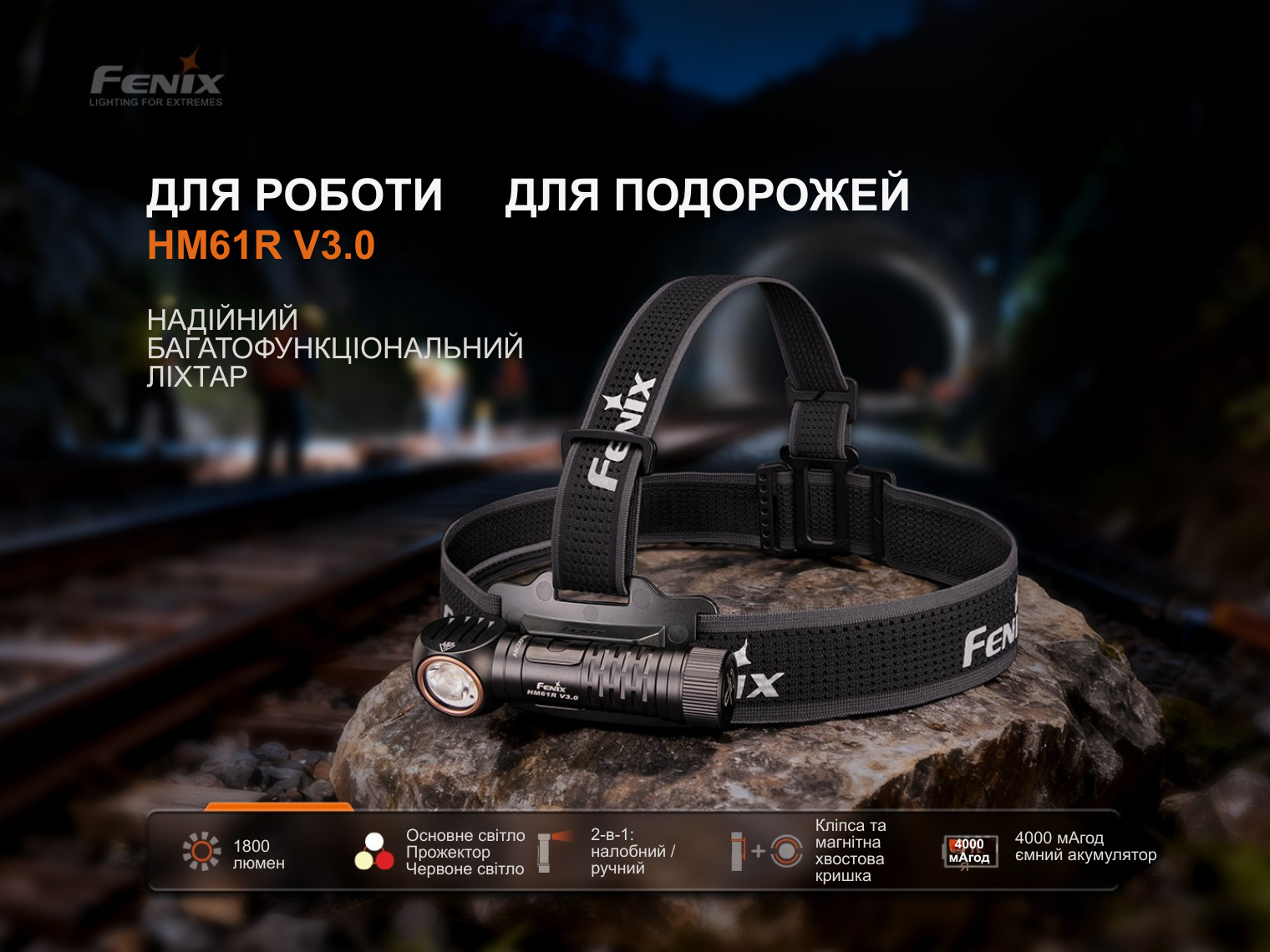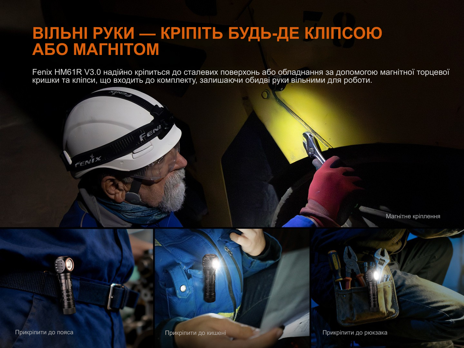 Fenix HM61R V3.0 — це універсальний освітлювальний пристрій, який завдяки знімному кріпленню та сталевій кліпсі трансформується з налобного ліхтаря в ручний або нагрудний.