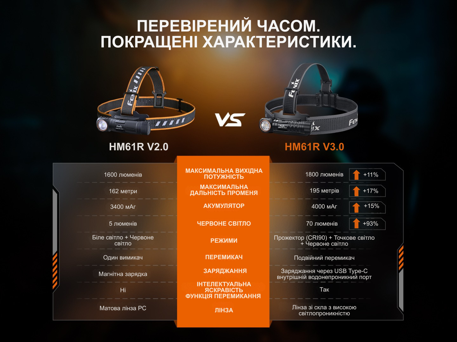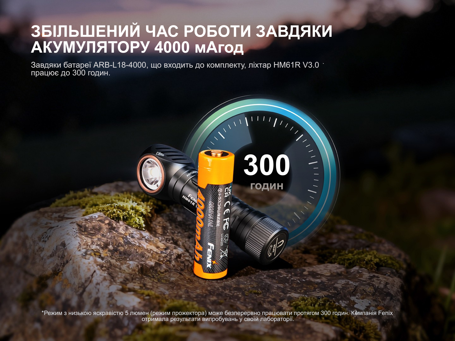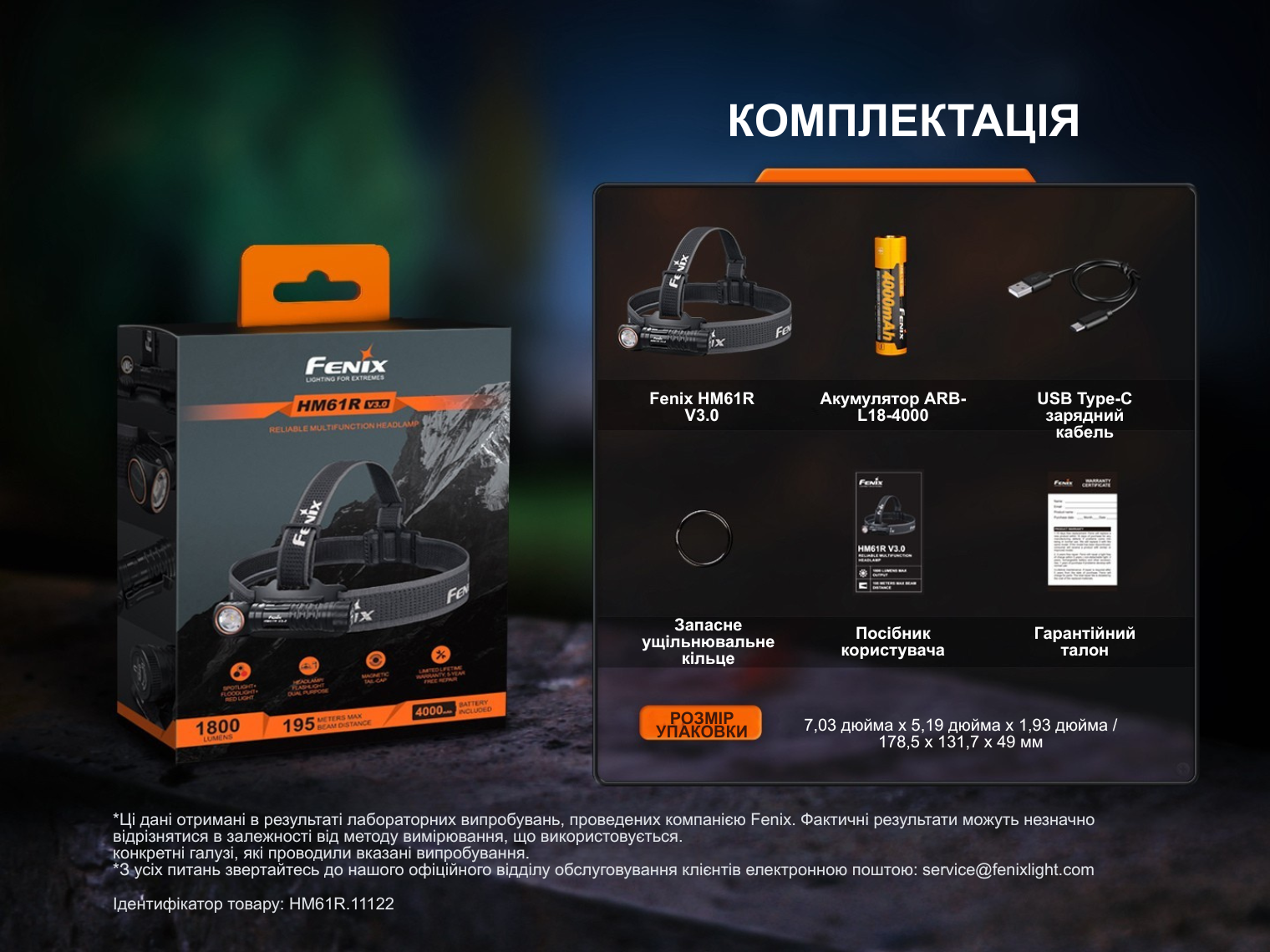 Комплектація | Ліхтар Fenix HM61R V3.0, акумулятор ARB-L18-4000, налобне кріплення (холдер і ремінець), зарядний кабель USB Type-C, запасне кільце ущільнювача, інструкція |