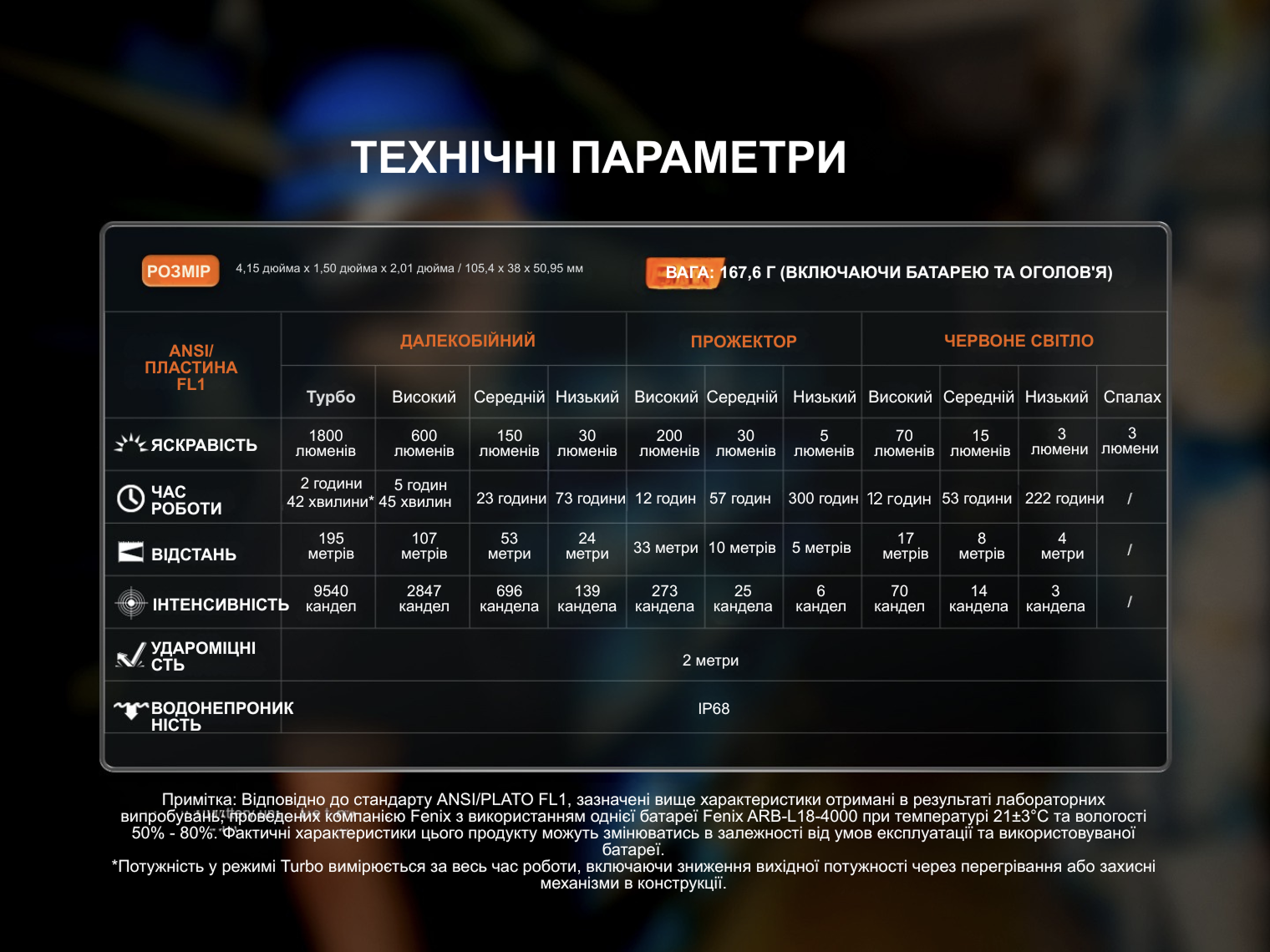 Зверніть увагу! Час роботи в режимі Турбо виміряно з урахуванням рівнів із меншою яскравістю. Ліхтар переходить на них при сильному нагріванні або якщо спрацював сенсор наближення до об'єкта.