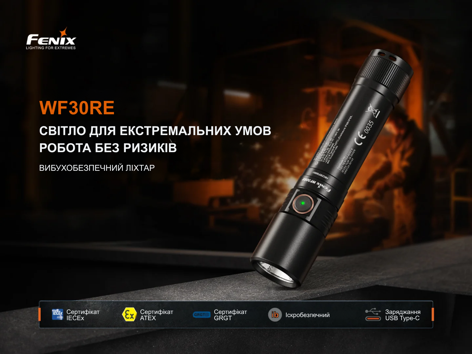 Комплектація | Fenix WF30RE Spark, аккумулятор Fenix ARB-L21-3000Ex, адаптер питания, кабель для зарядки USB Type-C, ремешок на руку, запасное уплотнительное кольцо, инструкция |