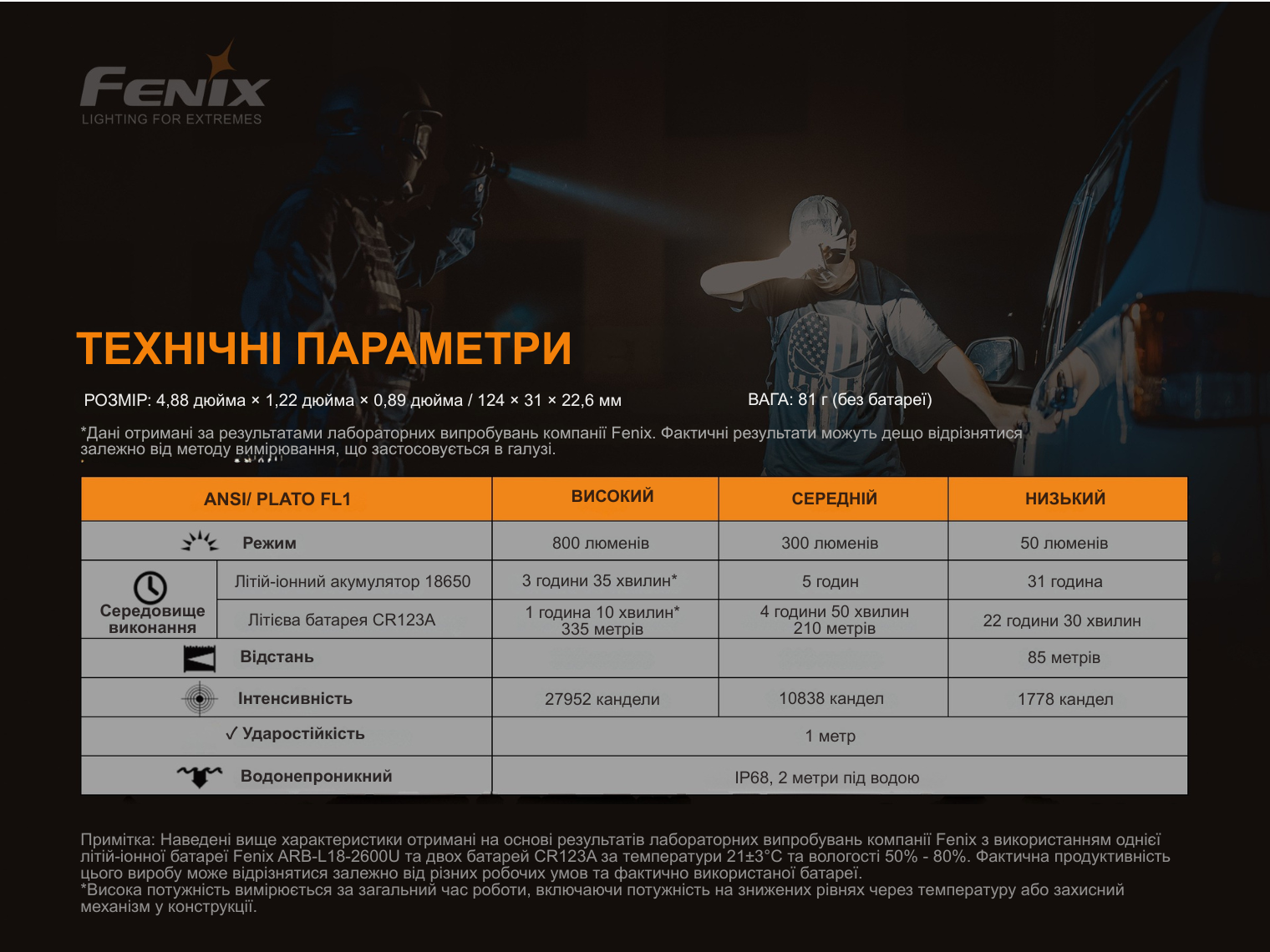 Час роботи батарейки CR123A | 1 година 10 хвилин* | 4 години 50 хвилин | 22 години 30 хв |