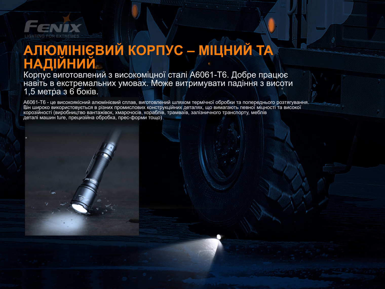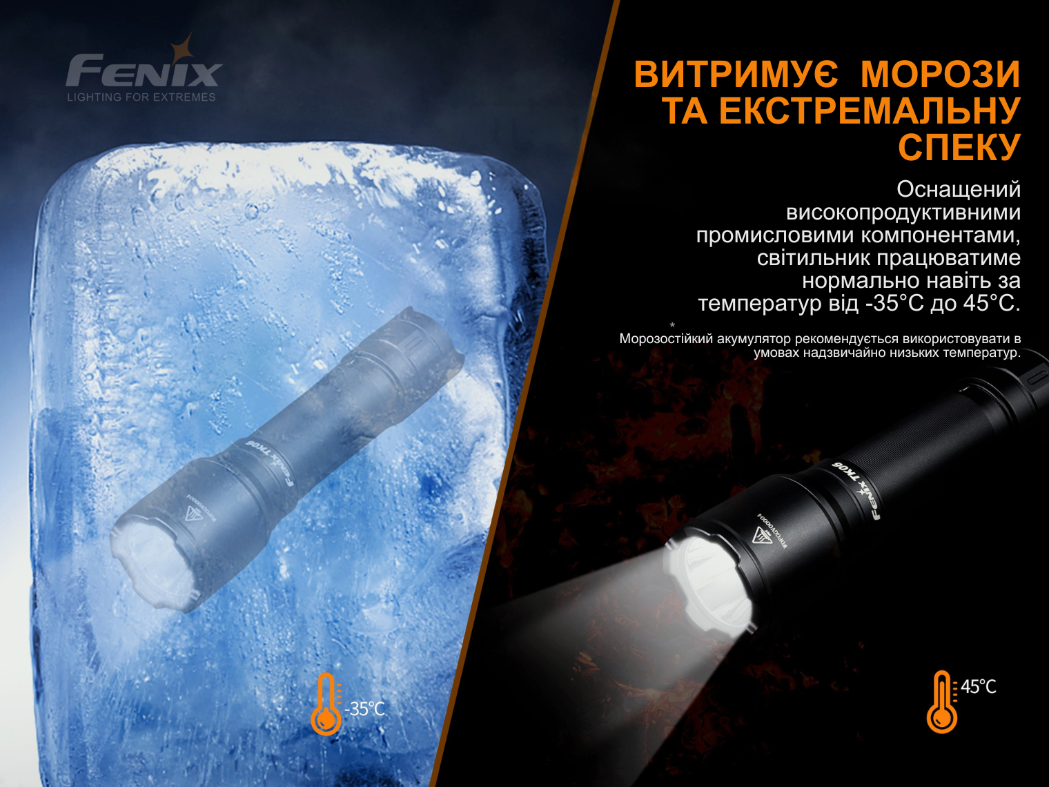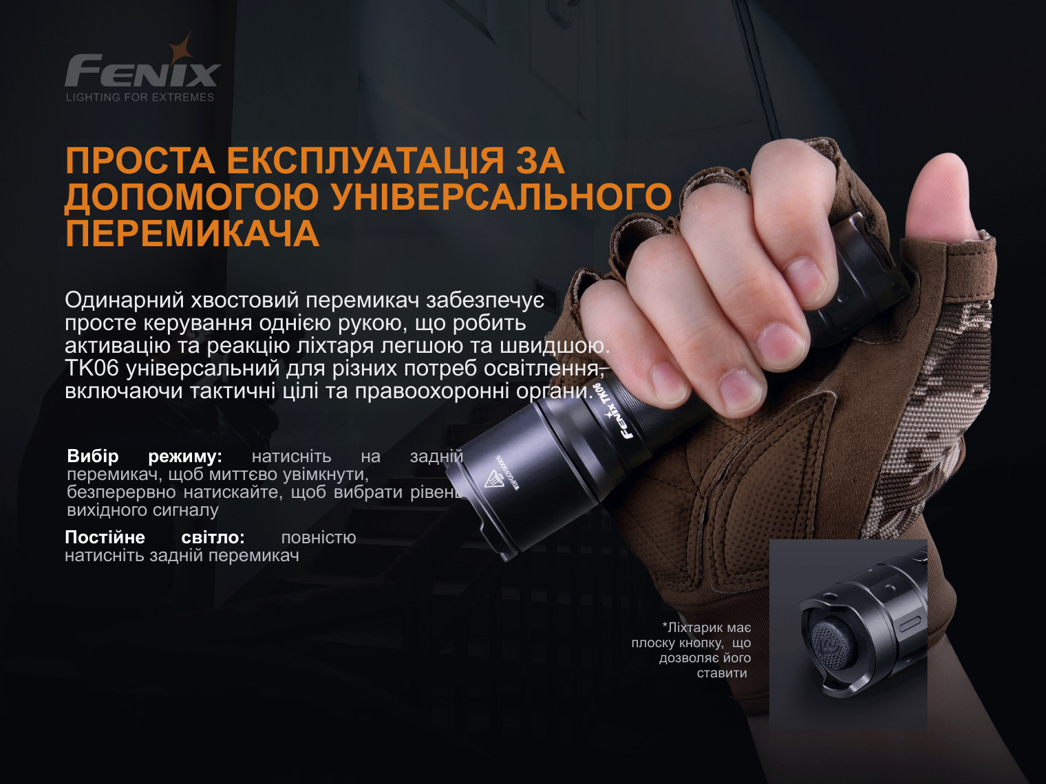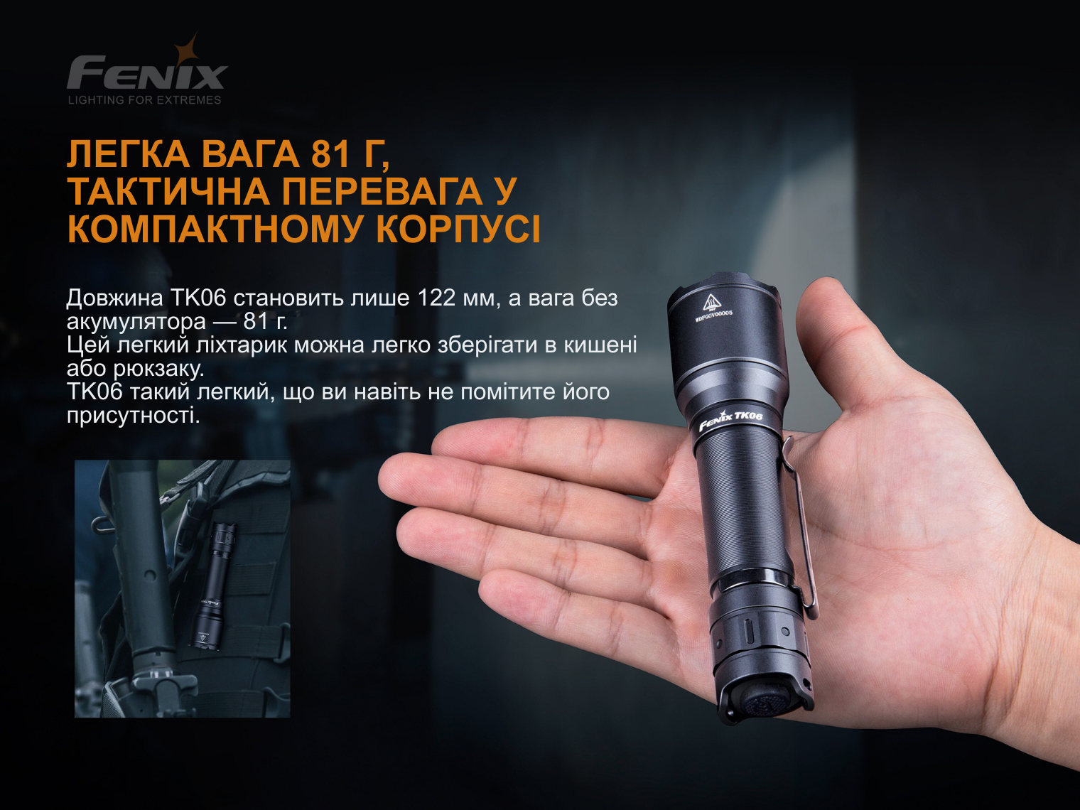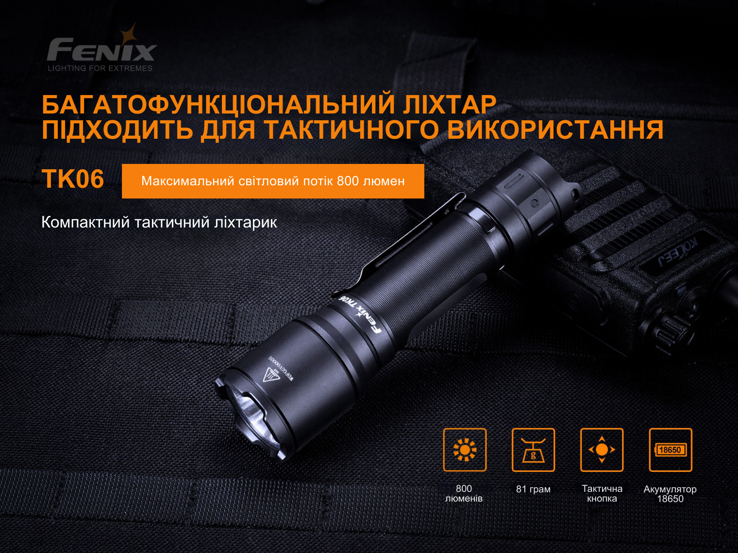 Модель Fenix TK06 являє собою багатофункціональний ліхтар. Підходить для щоденного застосування, як з метою роботи, так і дозвілля. Працює прилад на світлодіоді Luminus SST20 L4, з живленням від 18650 літій-іонної акумуляторної батареї. Це акумулятор ARB-L18-2600U. діод забезпечує холодне біле освітлення, і може світити протягом 50 тисяч годин. Модель видає найбільший світловий потік в 800 люменів, а найбільша відстань дії променя становить 335 метрів. Можете також застосовувати дві літієві батарейки CR123A.