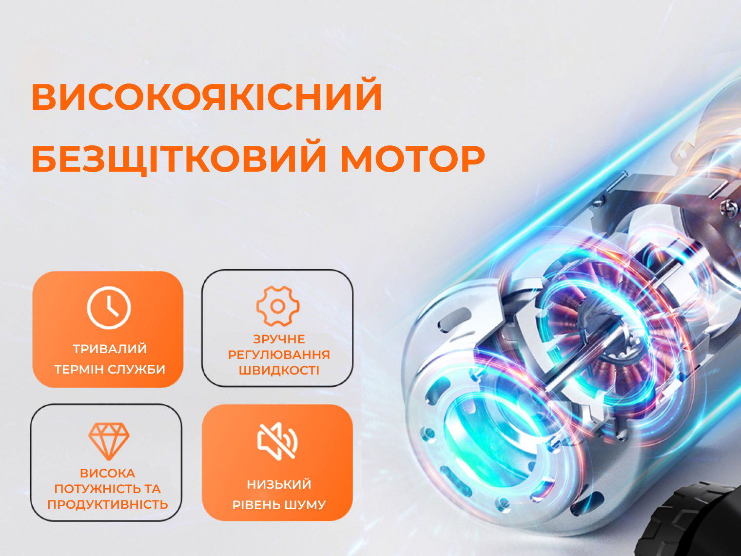 Відсутність бензинового двигуна та мережевого кабелю робить інструмент повністю автономним і мобільним. Пристрій працює на базі сучасного безщіткового мотора, який відрізняється підвищеним крутним моментом, низьким рівнем шуму та тривалим терміном експлуатації без спеціального обслуговування.
