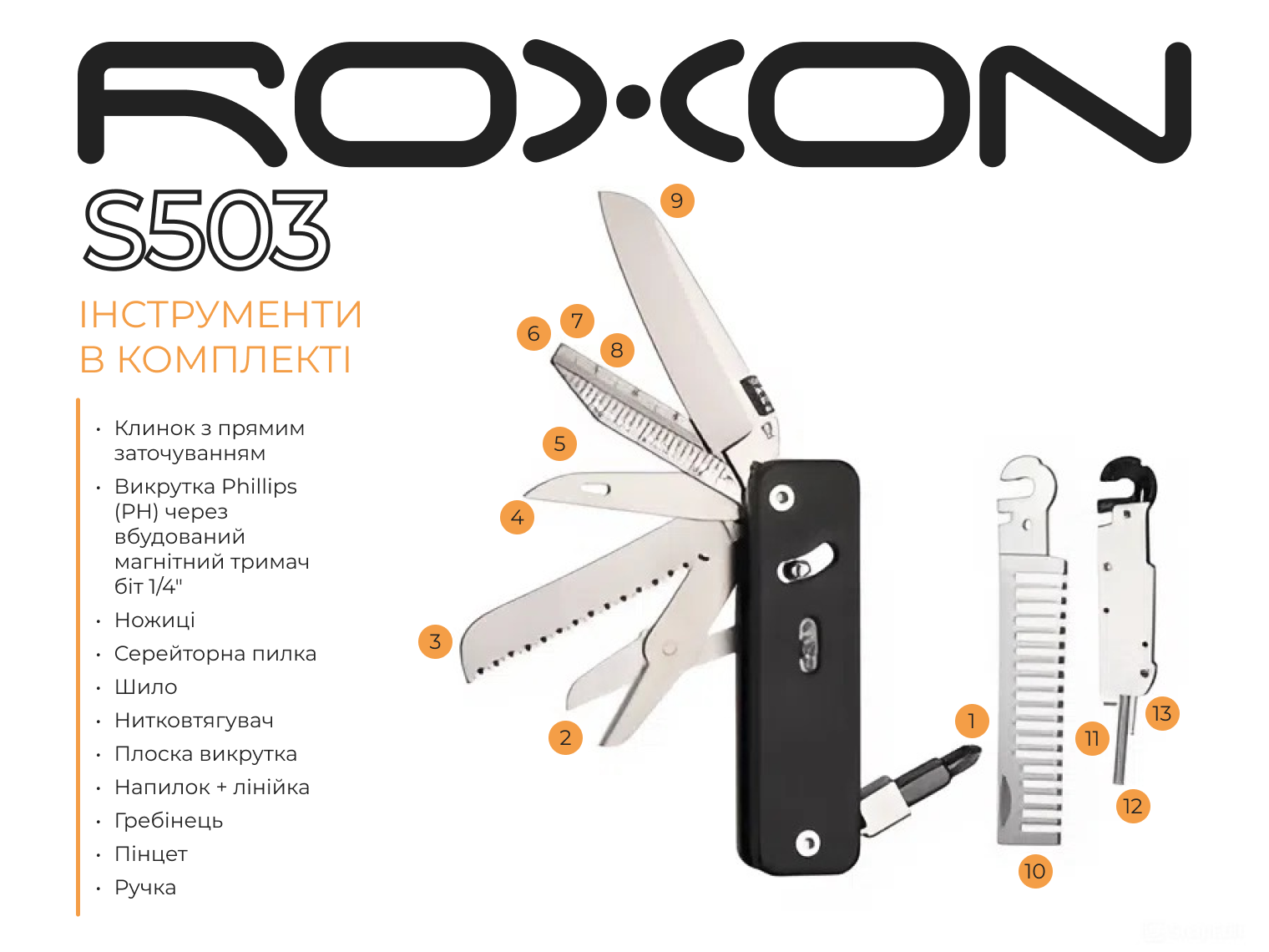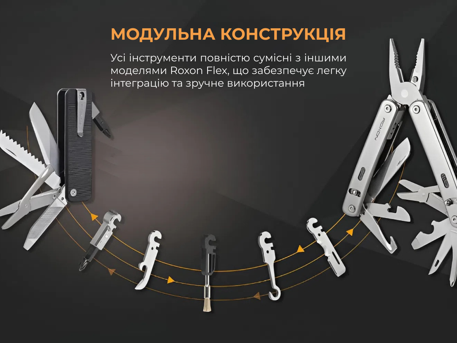Мультитул повністю сумісний з екосистемою Roxon FLEX (крім вбудованого 1/4″ тримача біт). Він постачається зі встановленими 6 базовими інструментами, 2 бонусними доповненнями, а також фіксованим магнітним тримачем біт 1/4″ з бітою PH.