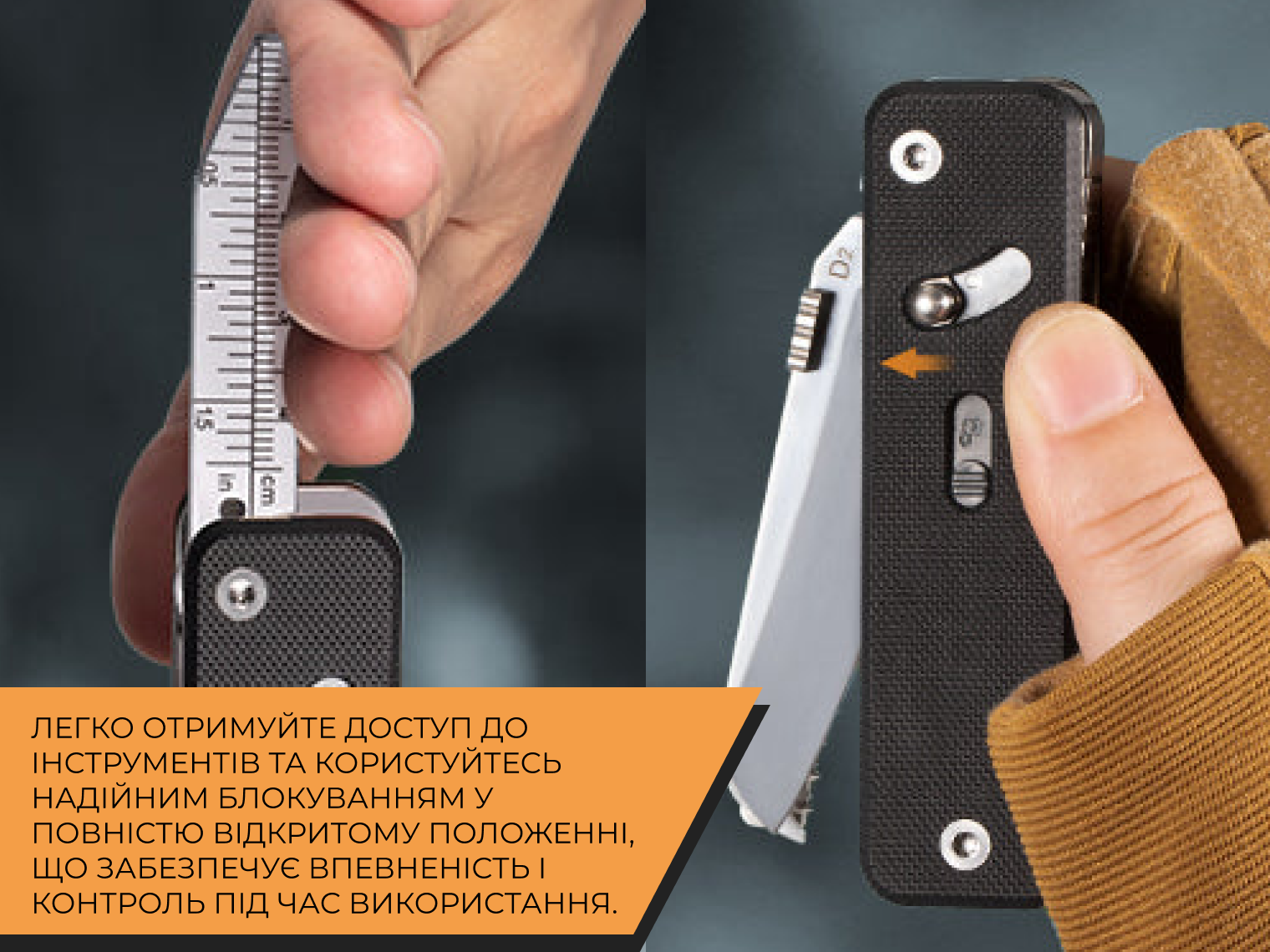 Мультитул Roxon Flex Companion S503G має унікальну особливість — модульну конструкцію. Ви можете збирати індивідуальний набір інструментів під власні завдання: для міста, велопоїздки, ремонтних робіт, кемпінгу та риболовлі. Водночас в дизайні збережена компактність, звична для мультитулів кишенькового формату — лише 9 х 2.3 х 2.2 см у закритому положенні.