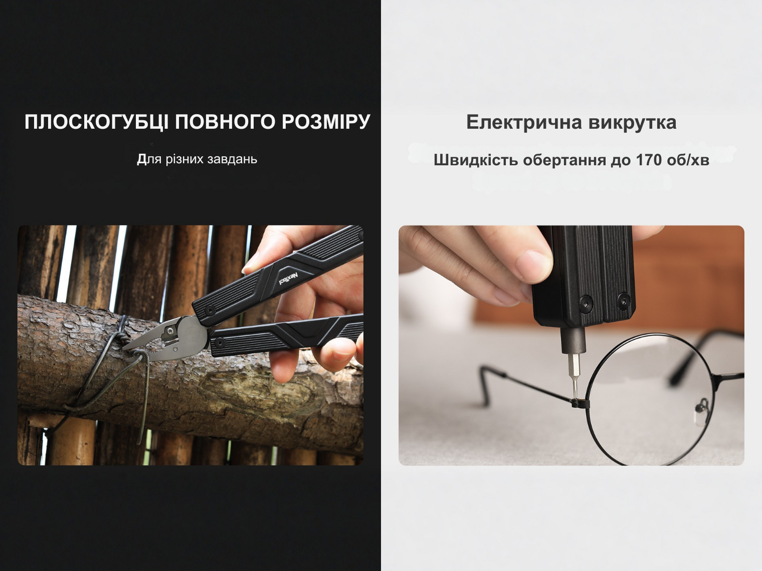 Комплектація | Мультитул, 10 змінних біт, зарядний кабель, фірмовий чохол |