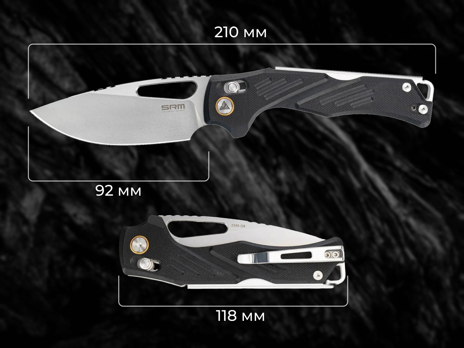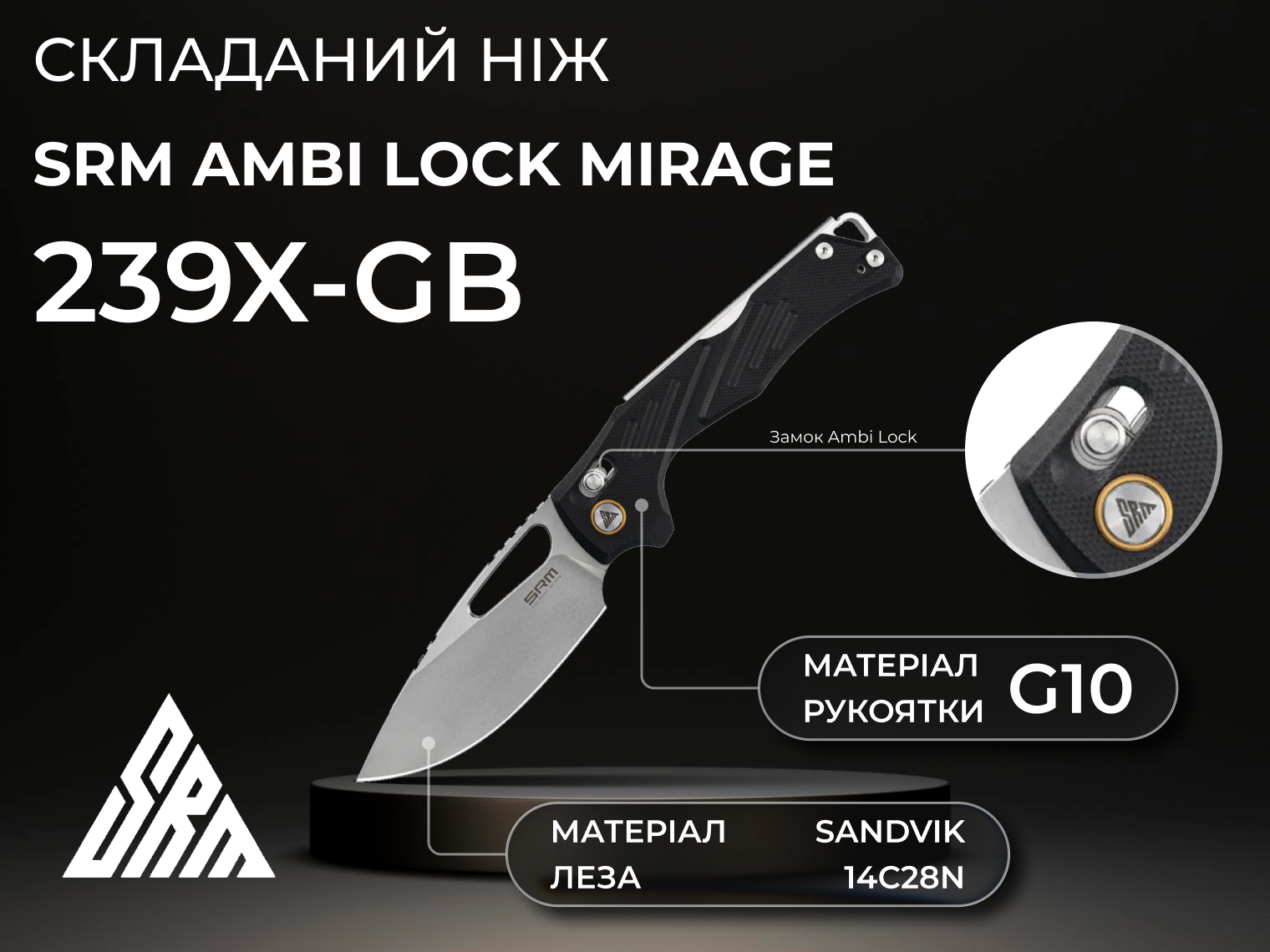 Повноформатний ніж Mirage 239X-GB зі складаним клинком позиціюється як мисливський інструмент, розрахований на активне різання щільних матеріалів та впевнену роботу в рукавичках. Модель також підходить для тактичних завдань, де потрібне особливо тверде та витривале лезо.