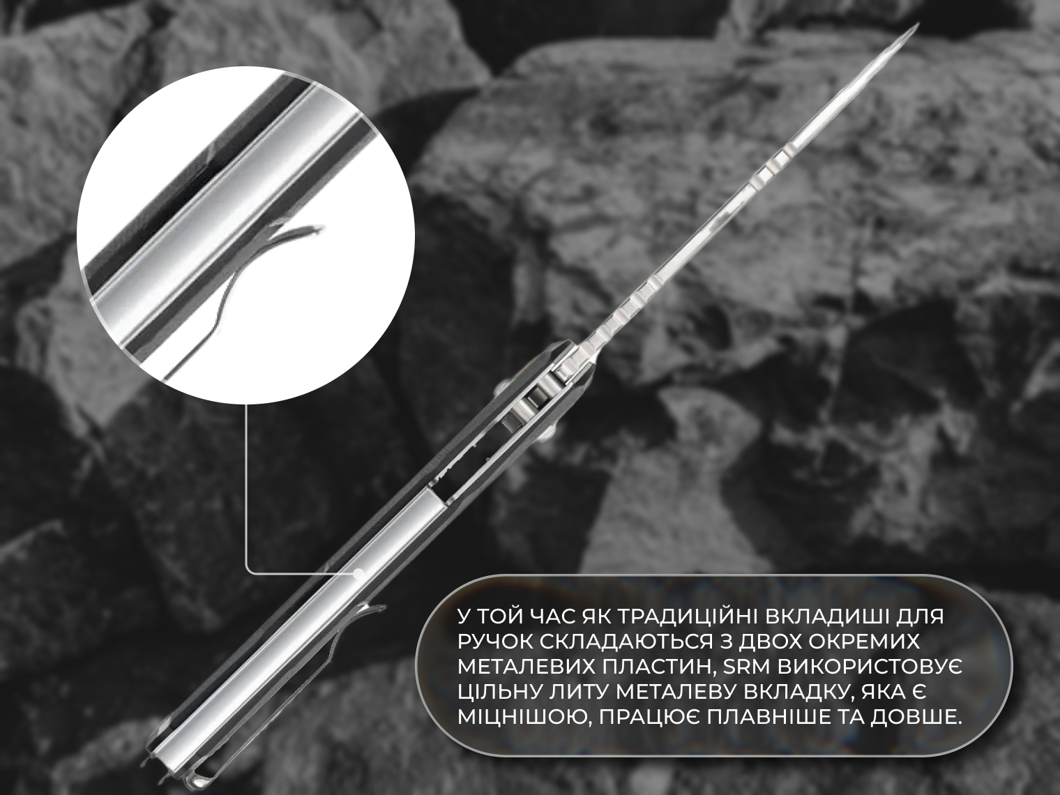 Замок Crossbar Lock замикає клинок поперечним пружним штифтом і однаково зручно керується як правою, так і лівою рукою. У фірмовій модифікації від SRM замок розрахований на однопальцеве розблокування з будь-якого боку руківʼя, що відрізняє механізм від багатьох аналогів.