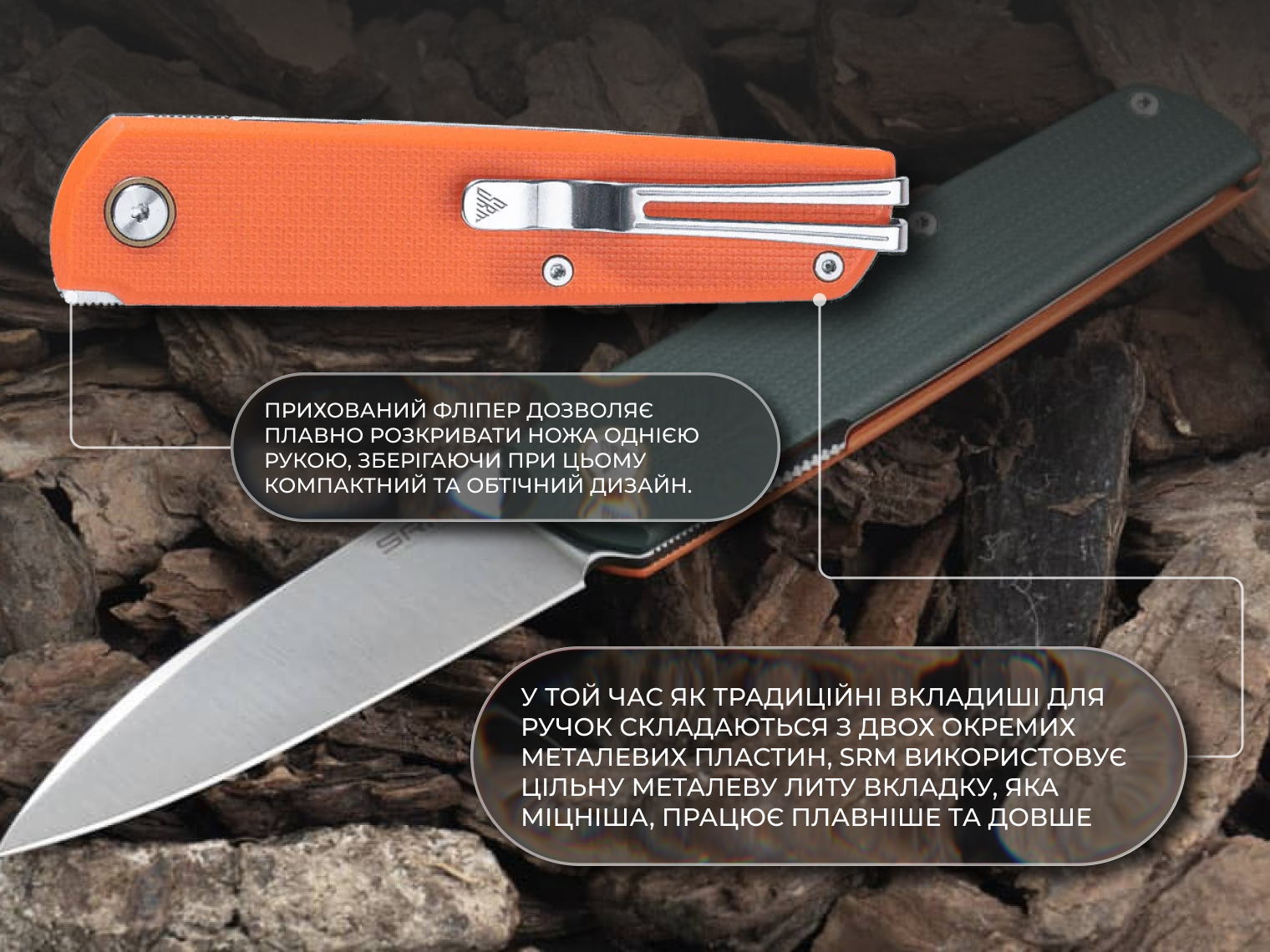 Візуально ніж 408L-GX від SRM має дуже акуратне оформлення: тонкий профіль та чисті лінії з акцентними плашками роблять посадку на кишені простою та зручною. Для фіксації передбачено фірмову кліпсу Ambi Clip з нержавіючої сталі — її можна встановлювати з будь-якого боку руківʼя без використання додаткових інструментів.