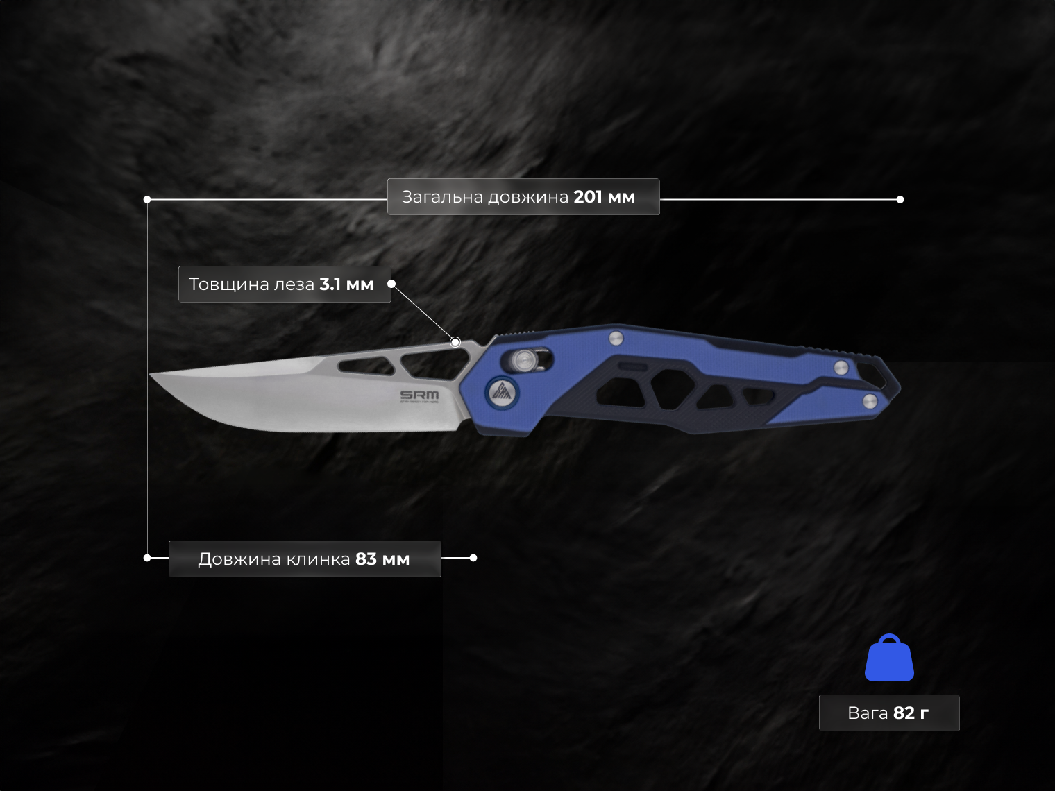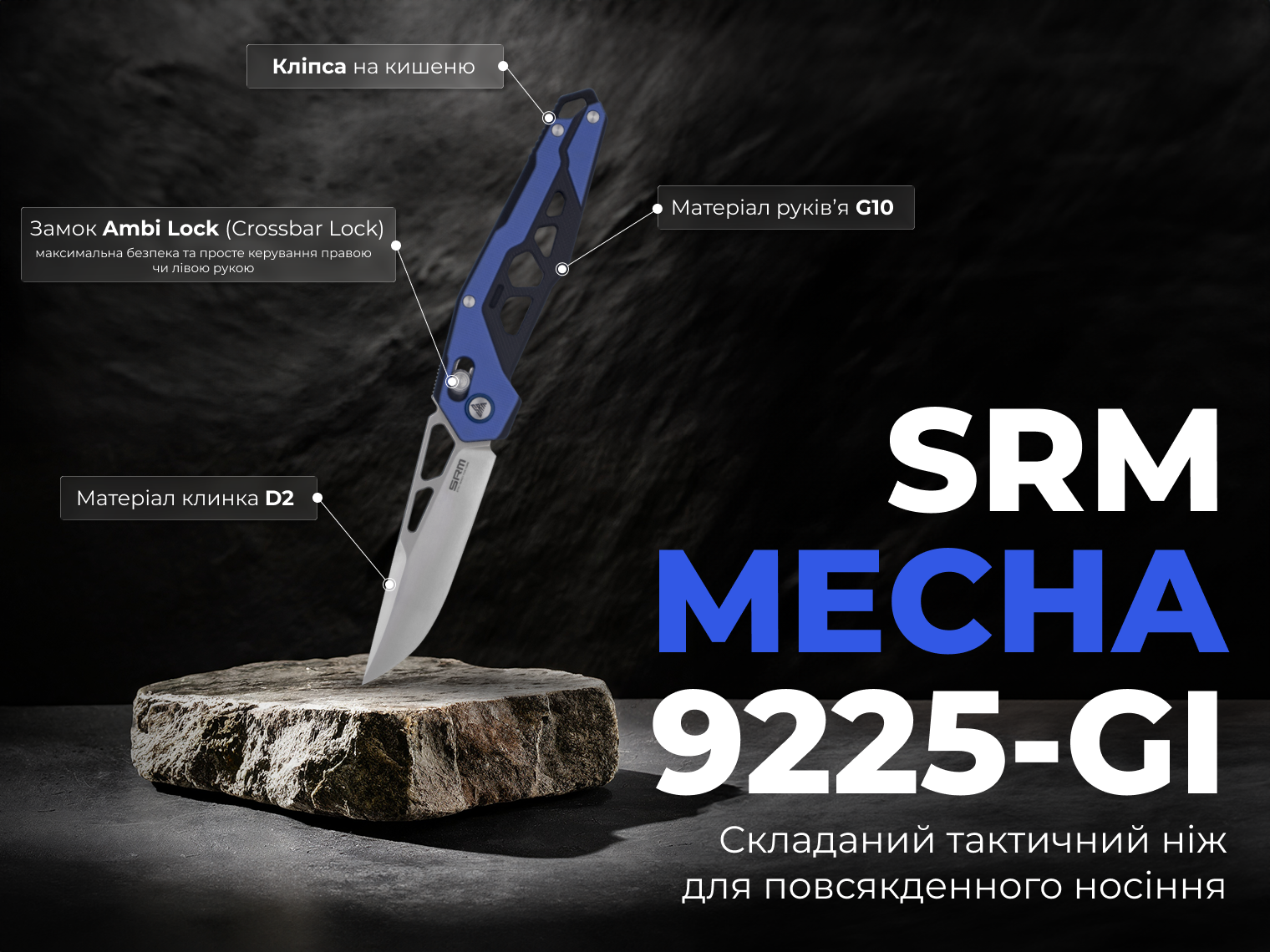 Ніж SRM Mecha підходить для щоденних робіт у місті чи під час відпочинку на природі. Він легко розрізає щільний картон, пластик, мотузки або дерево. Модель поєднує високу твердість сталі та мінімальну вагу. Завдяки цьому ніж майже не відчувається в кишені штанів.