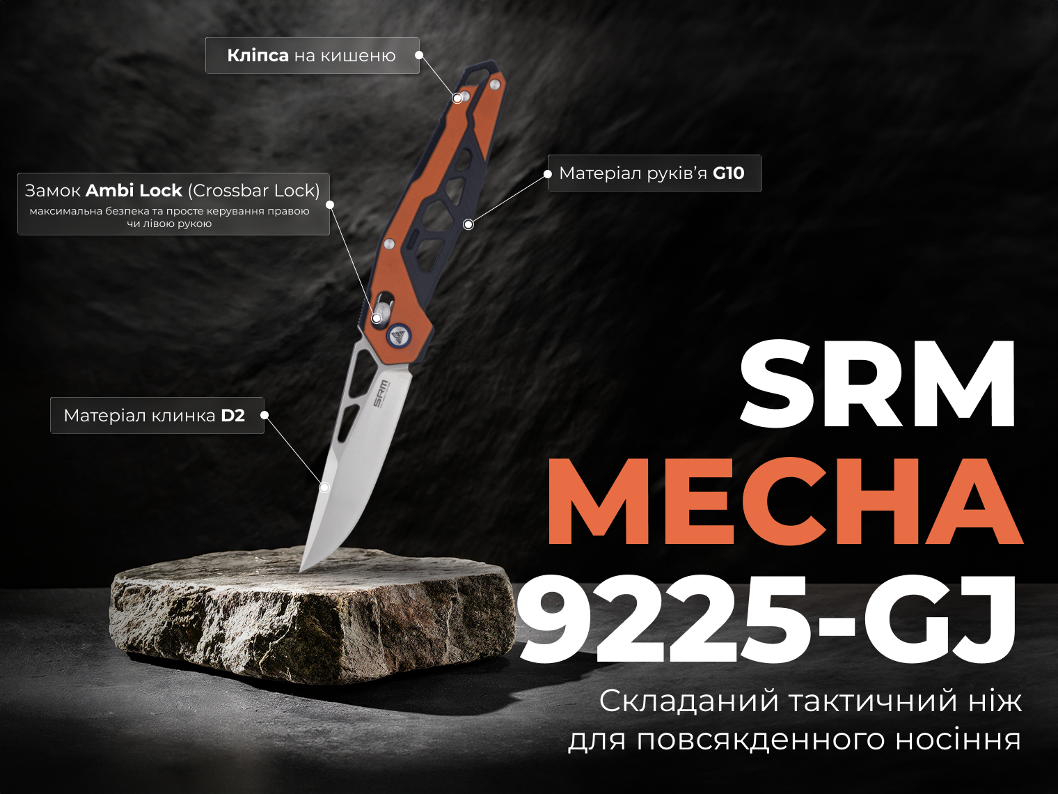 Складаний ніж SRM Mecha поєднує агресивний утилітарний дизайн та зносостійкі матеріали. Завдяки полегшеному руків'ю вагою всього 82 г, модель ідеальна для щоденного використання та виконання складних робіт, зокрема для різання цупкого картону, пластикових стяжок або зачистки дротів.