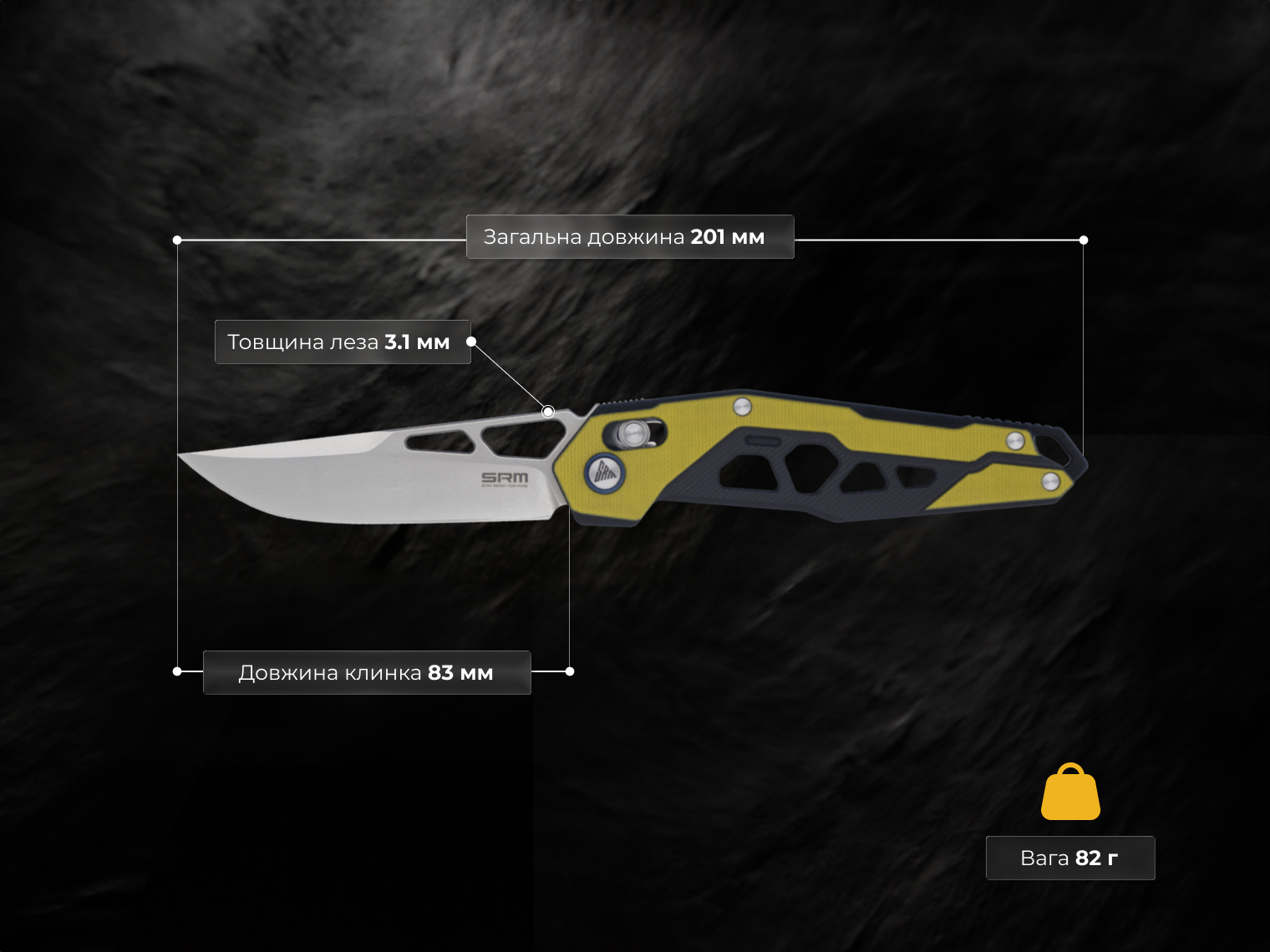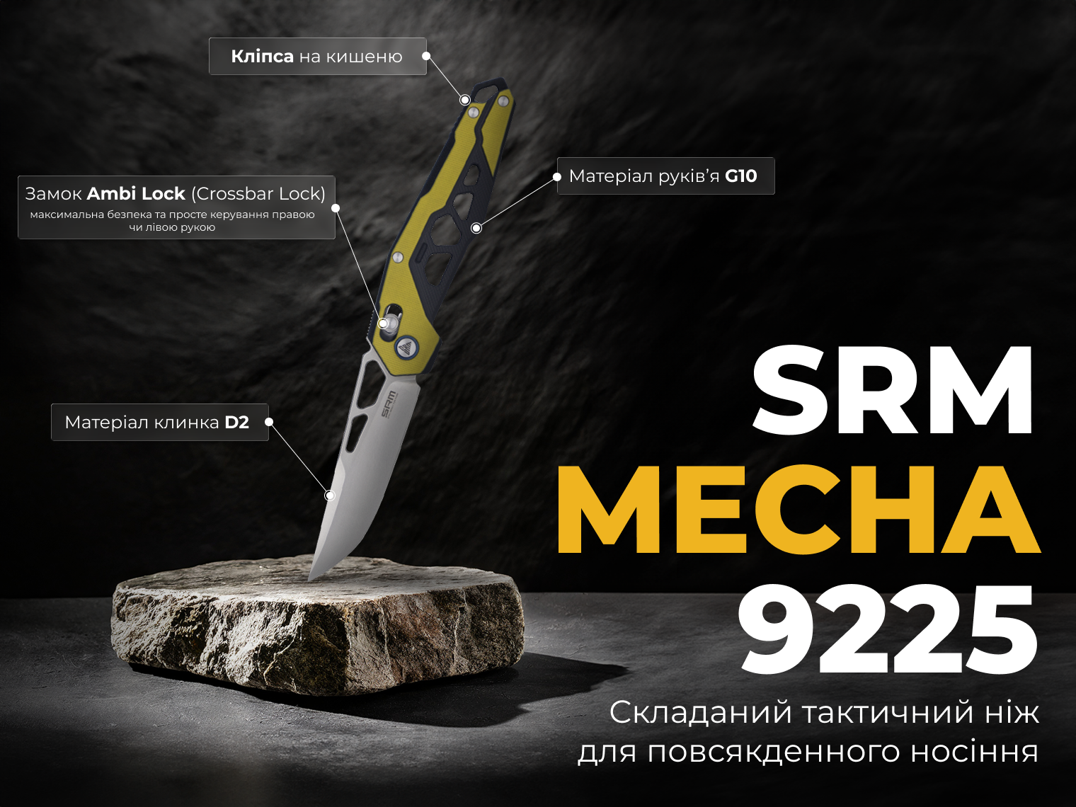 Ніж SRM Mecha розроблений для щоденних завдань у місті та на природі. Він підходить для роботи з пакуванням, канатами або використання в походах. Головна перевага моделі — висока твердість сталі при мінімальній вазі. Його зручно носити навіть на легкому одязі.