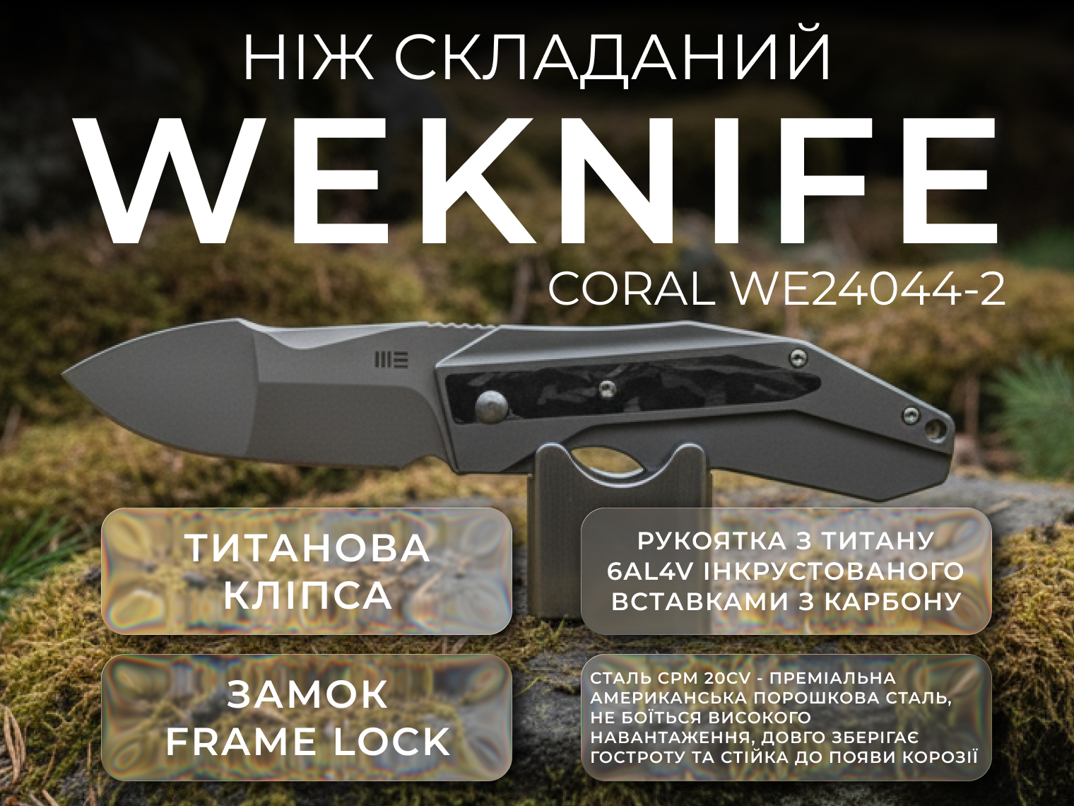 У преміальному складаному ножі WeKnife Coral поєднуються сучасний індустріальний стиль та інженерна точність, що робить конструкцію довговічною у використанні. Дизайнер моделі — Густаво Т. Чекіні, бразильський ножовий майстер, володар 20 нагород та кількох патентів за унікальні рішення при створенні своїх різальних інструментів.