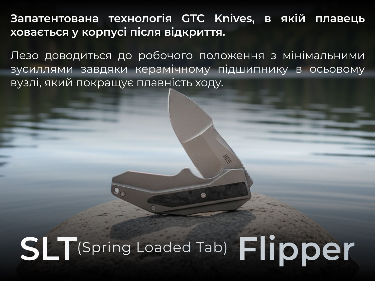 Для відкриття WeKnife Coral використовується унікальний механізм SLT (Spring Loaded Tab) Flipper — запатентована технологія GTC Knives, в якій плавець ховається у корпусі після відкриття. Осьовий вузол працює на керамічних підшипниках, що забезпечує бездоганно швидке відкривання без зайвих зусиль.