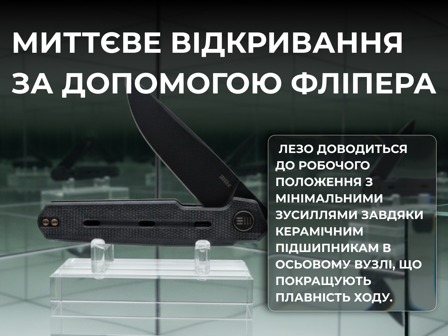 Ніж відкривається миттєво — достатньо натиснути на плавець фліпера. Завдяки керамічним підшипникам в осьовому вузлі рух виходить плавним і передбачуваним, а дрібні насічки на обуху спрощують упор пальцем для максимального контролю леза під час силових робіт.