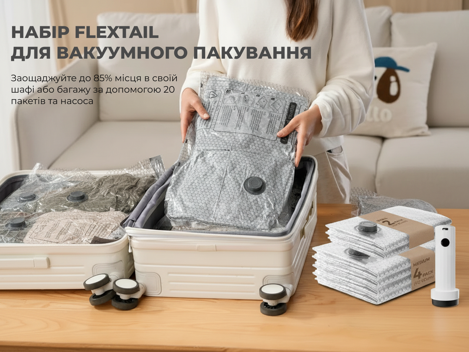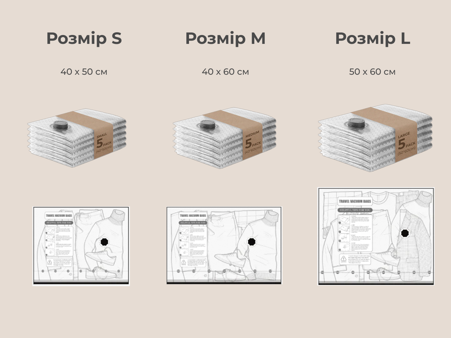Система підходить для будь-якого текстилю: від футболок і білизни до важких зимових пуховиків. Використання набору виключає появу «бугрів» у валізі — речі стають пласкими та рівномірно розподіляються по всій площі сумки.