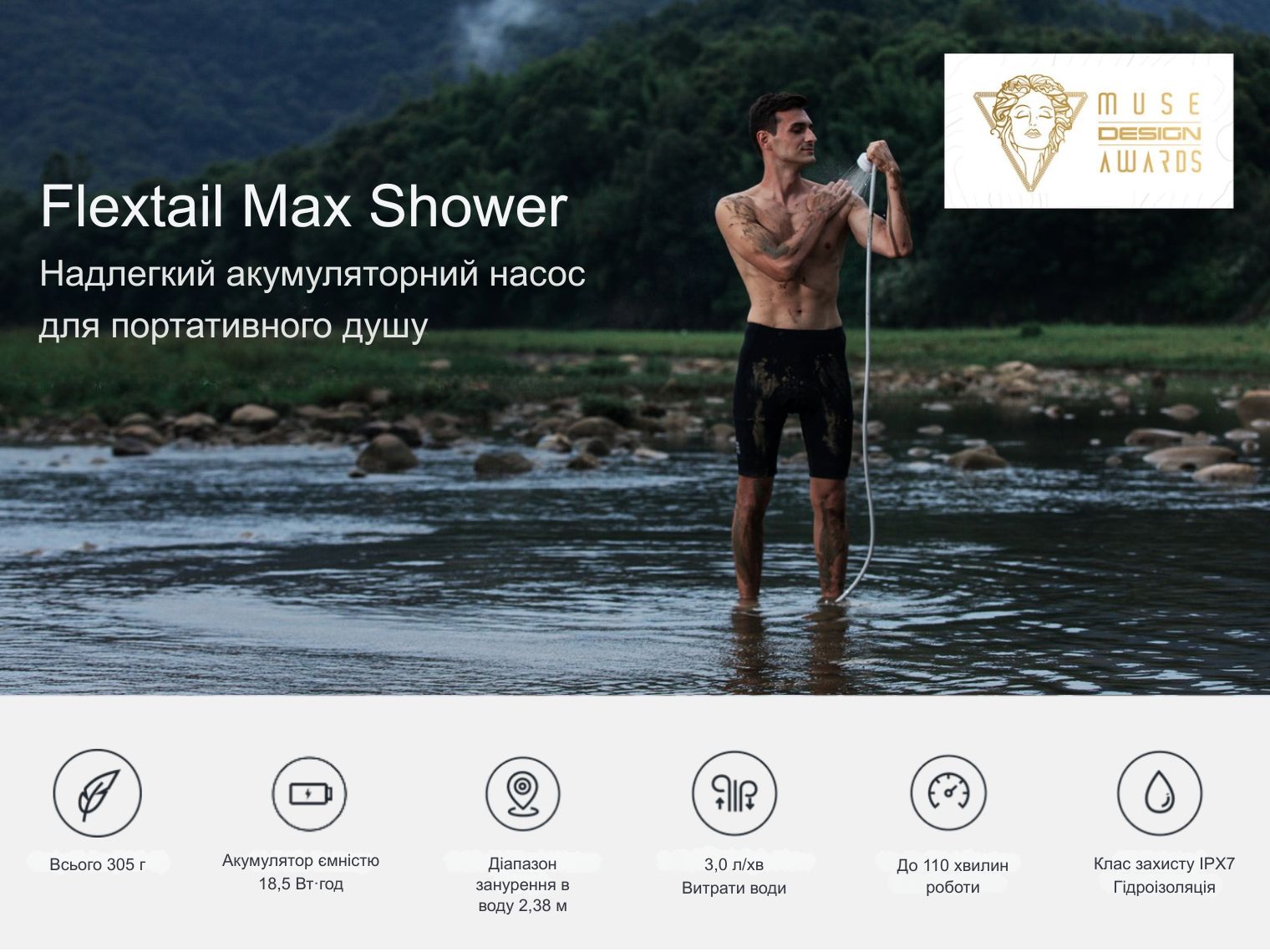 Flextail Max Shower — компактна акумуляторна система, яка дозволяє приймати душ у кемпінгу, на дачі, на пляжі, в автоподорожі.